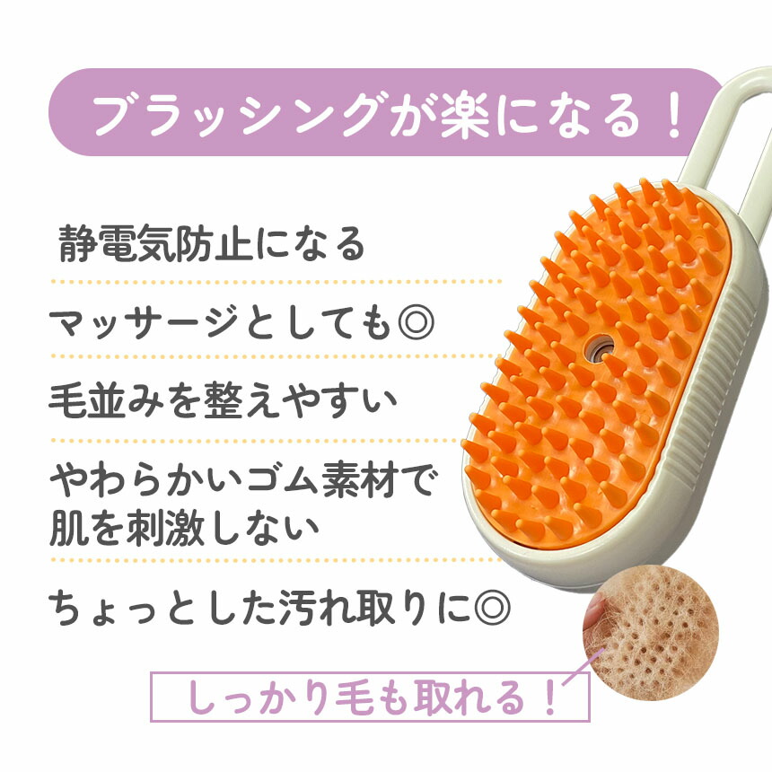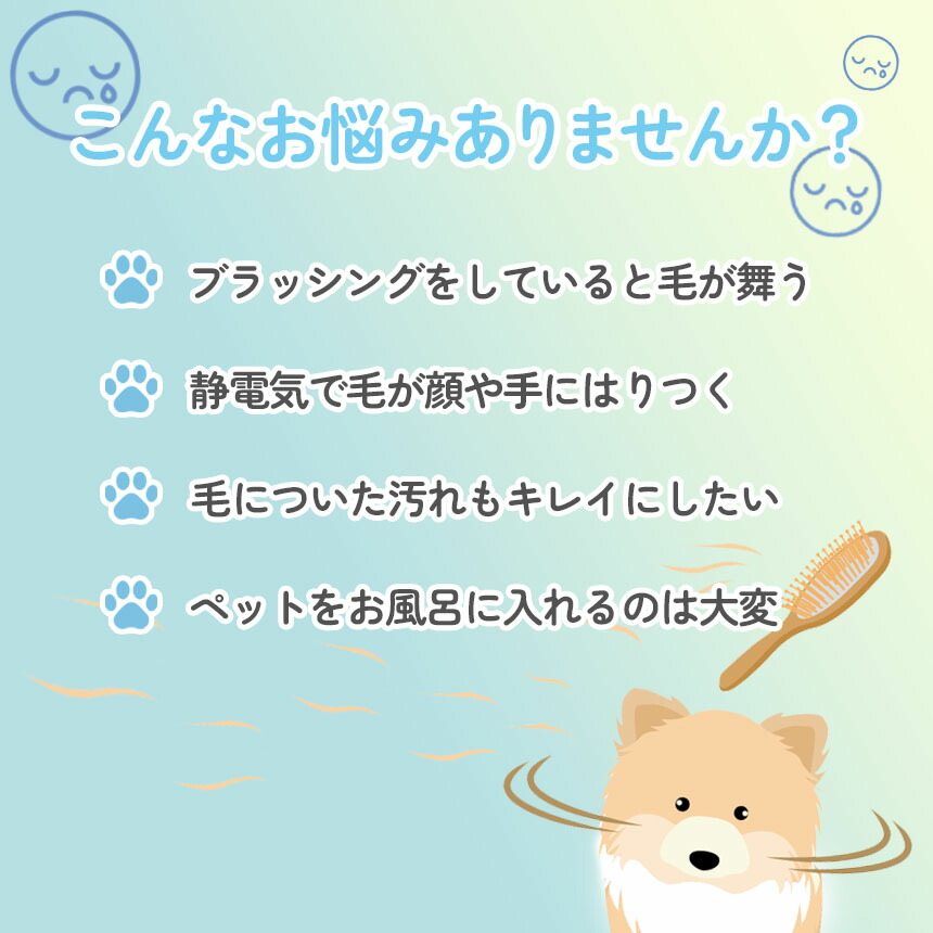 ミストを当てながらブラッシングをすることで、ブラッシング中に抜けた毛の飛び散りや静電気の発生を防止し、毛の絡まりや汚れを取り除きやすくなります。