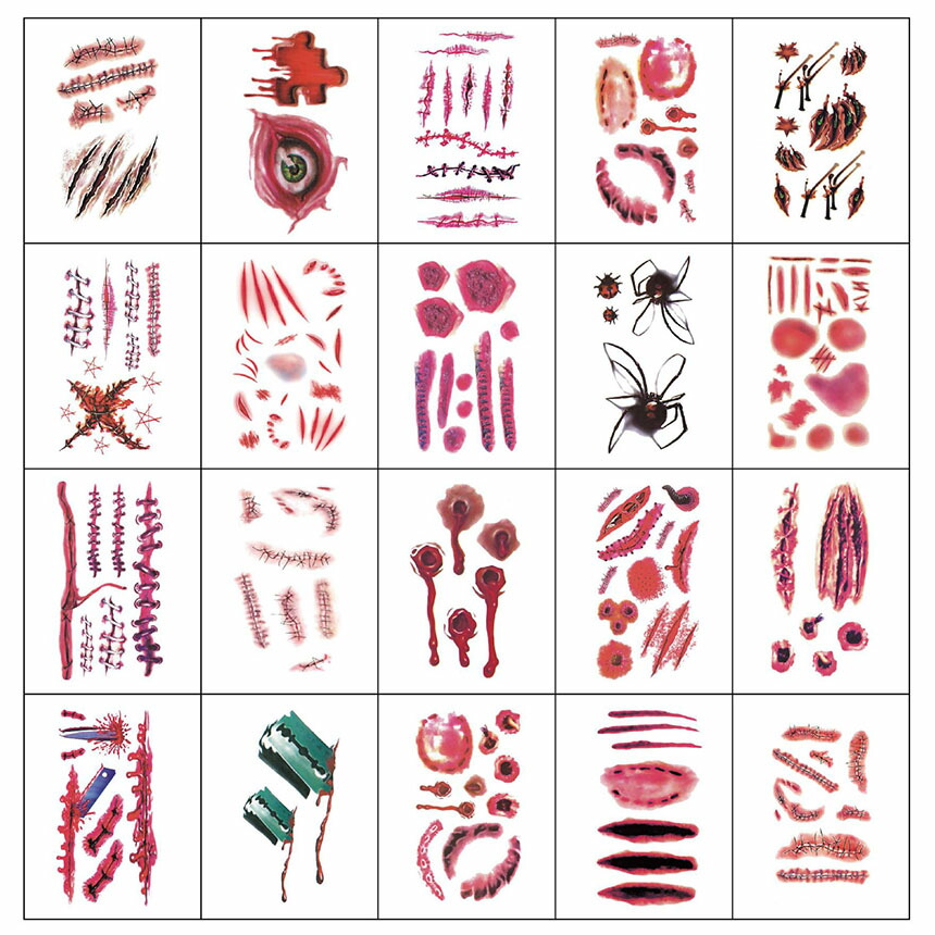 切り傷や縫合痕、痣、裂傷、流血など様々な種類の特殊メイク風タトゥーシールです。