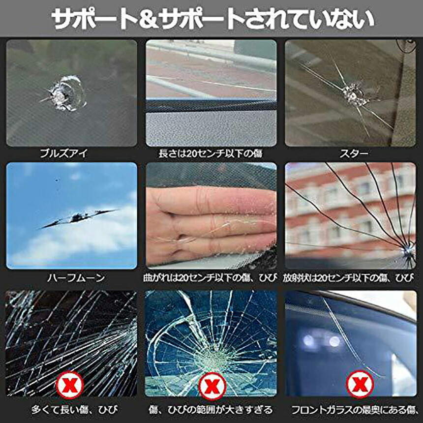 適用範囲:本製品は車のフロントガラスにのみ適しており、車の窓ガラスやその他のガラスには使用に適していません。補修できる傷の種類はブルズアイ、スタ一、ハーフムーン、長さは20センチ以下の傷、曲がれは20センチ以下の傷、ひび、放射状は20センチ以下の傷、ひび、または、直径が1インチ(25mm)の組み合わせ亀裂の修復 。