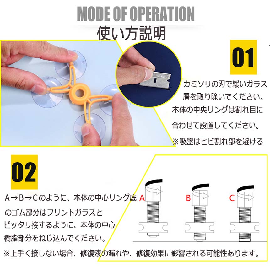 3.合わせガラスの内側ガラス層まで傷がある場合や線状、クモの巣状の亀裂には使用できません。