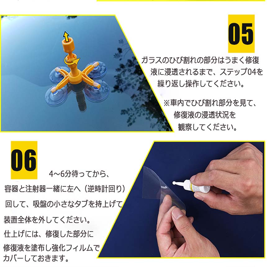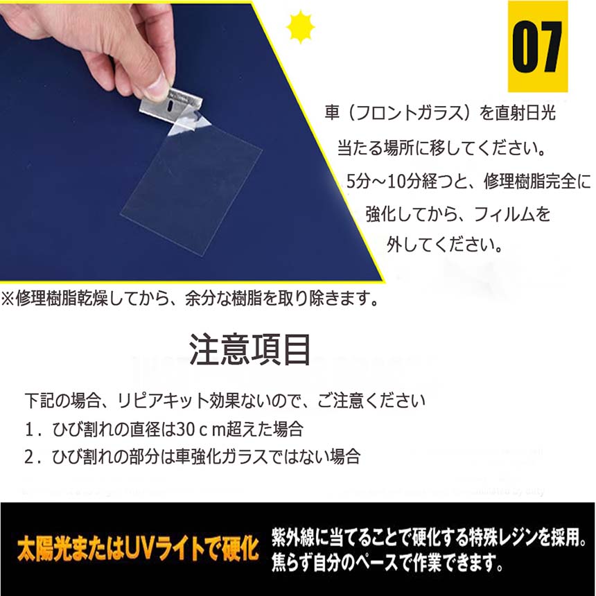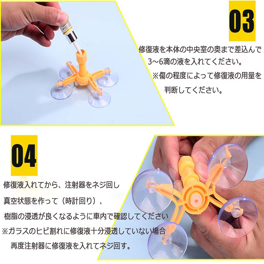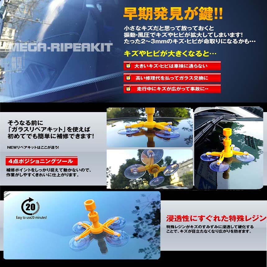 適用範囲:本製品は車のフロントガラスにのみ適しており、車の窓ガラスやその他のガラスには使用に適していません。補修できる傷の種類はブルズアイ、スタ一、ハーフムーン、長さは20センチ以下の傷、曲がれは20センチ以下の傷、ひび、放射状は20センチ以下の傷、ひび、または、直径が1インチ(25mm)の組み合わせ亀裂の修復 。