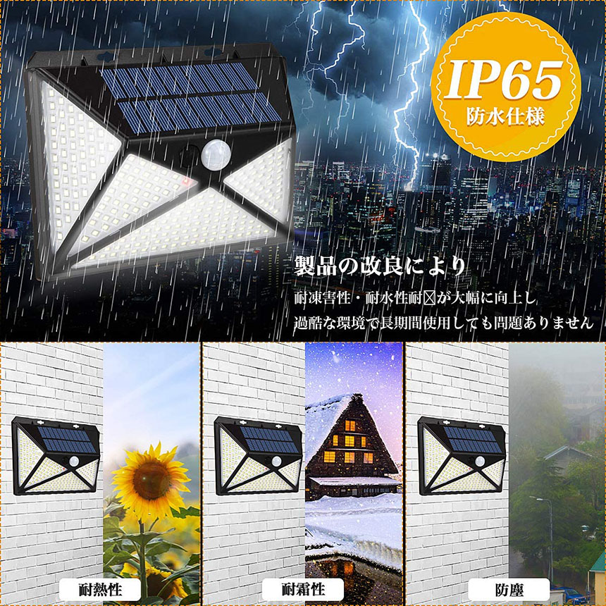 LED ソーラーライトはIP65防水防塵仕様で、悪天候でも耐えるように設計されています。屋根のない場所、外からの雨にさらされるような場所に設置しても安心です。極端な低温、曇、雨、または雪の日は十分に充電ができず点灯時間が短くなります。