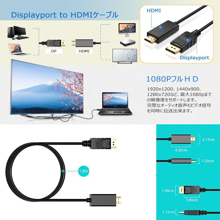 1.8mの長さで、この製品を通じて、パソコンとHDTVなどHDMIポート付きデバイスを簡単に接続出来ます。