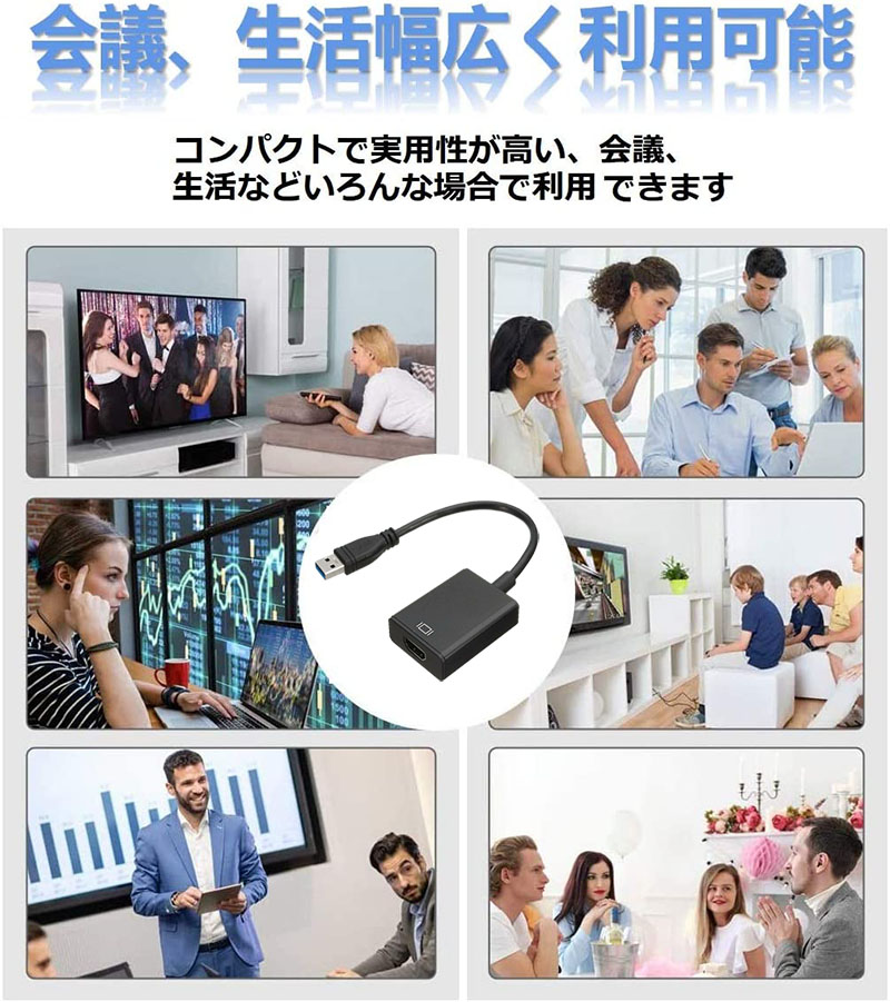 USB HDMI 変換 アダプターを利用して、パソコンからの画面をVGAポートが付くプロジェクタ、テレビ、HDTV、モニタ、LCD ディスプレイ等に接続して大画面で、高画質の映像やムービー、PPTを楽しめます。生活や仕事場で大活躍します。
