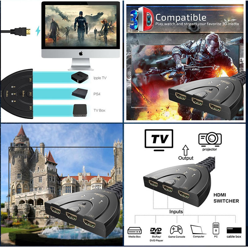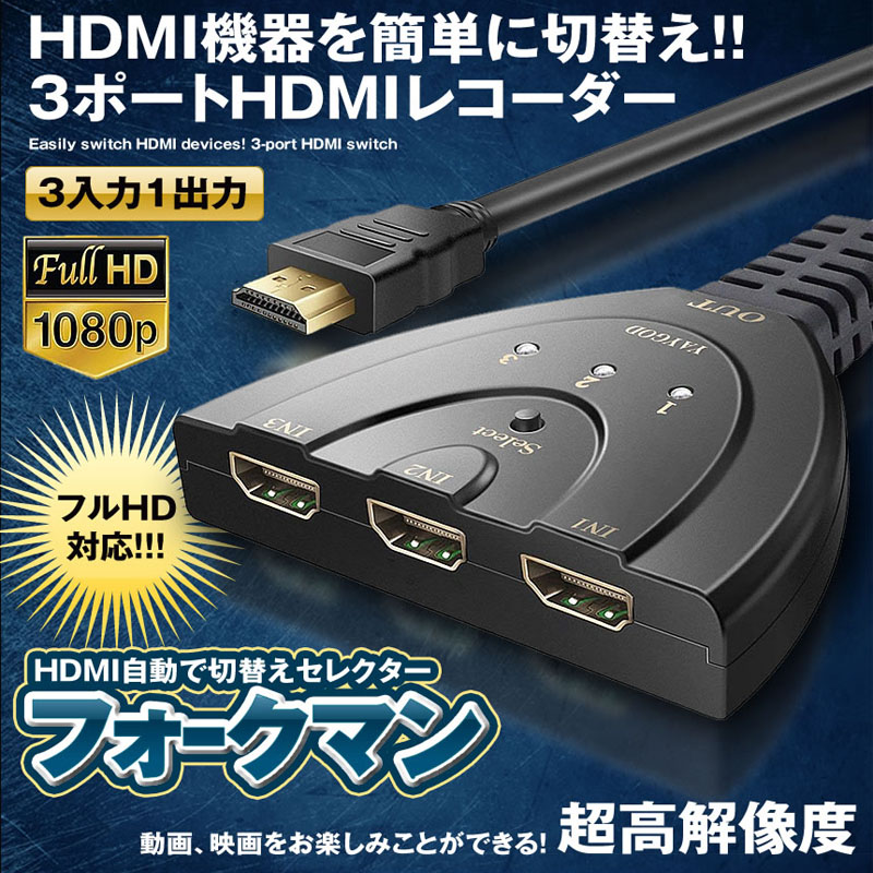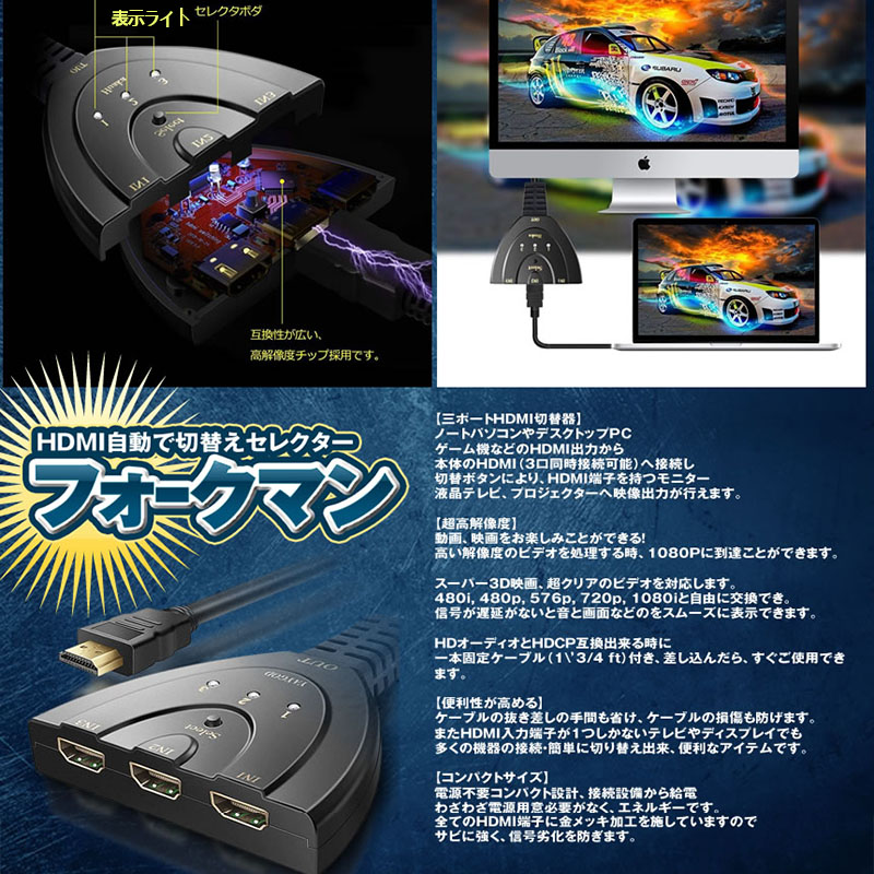 ●ノートパソコン、デスクトップ、ゲーム機などのHDMI出力もつ本体をHDMI 3口同時接続し、HDMI端子を持つモニター、液晶テレビ、プロジェクターへ映像出力行えます。切り替えスイッチによる手動切替も可能です。