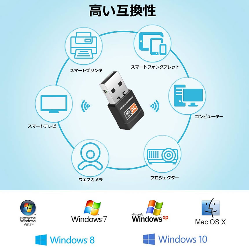 パソコンのUSB端子に接続することで、最大433Mbps(規格値)の高速Wi-Fi通信が可能になります。