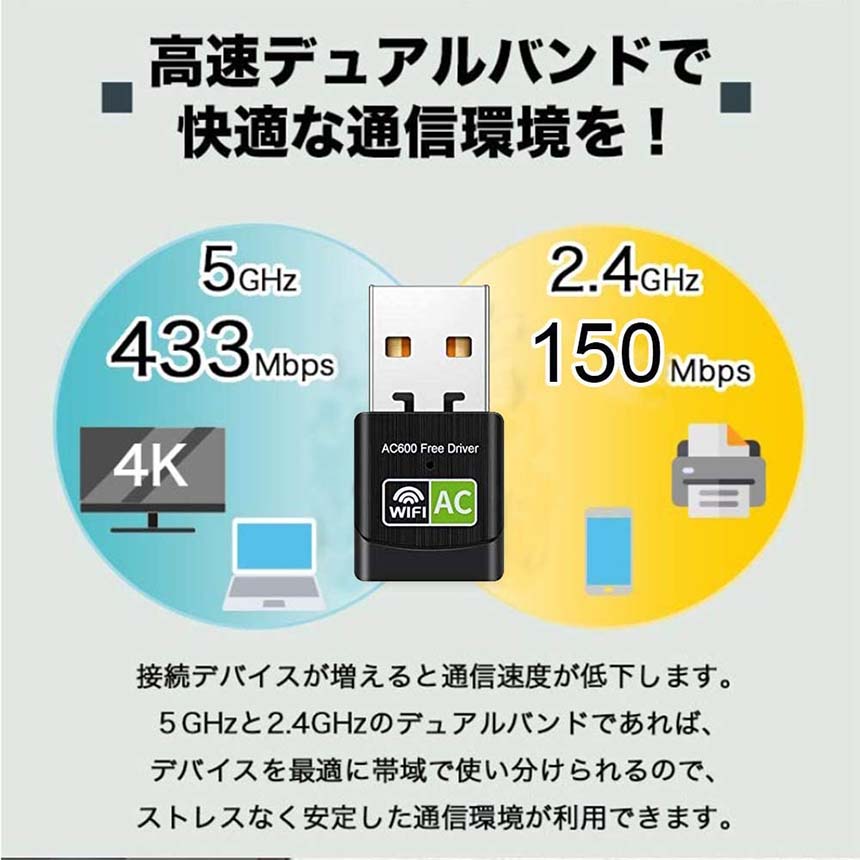 【600Mbpsの高速通信】本製品は802.11acに準拠し、デバイスにセットすることで最大433+150Mbpsの超高速ワイヤレス接続が可能になります。従来の11nに比べ約2.8倍の高速転送を実現。大容量データを短時間で転送でき、HD動画もスムーズに再生できます。