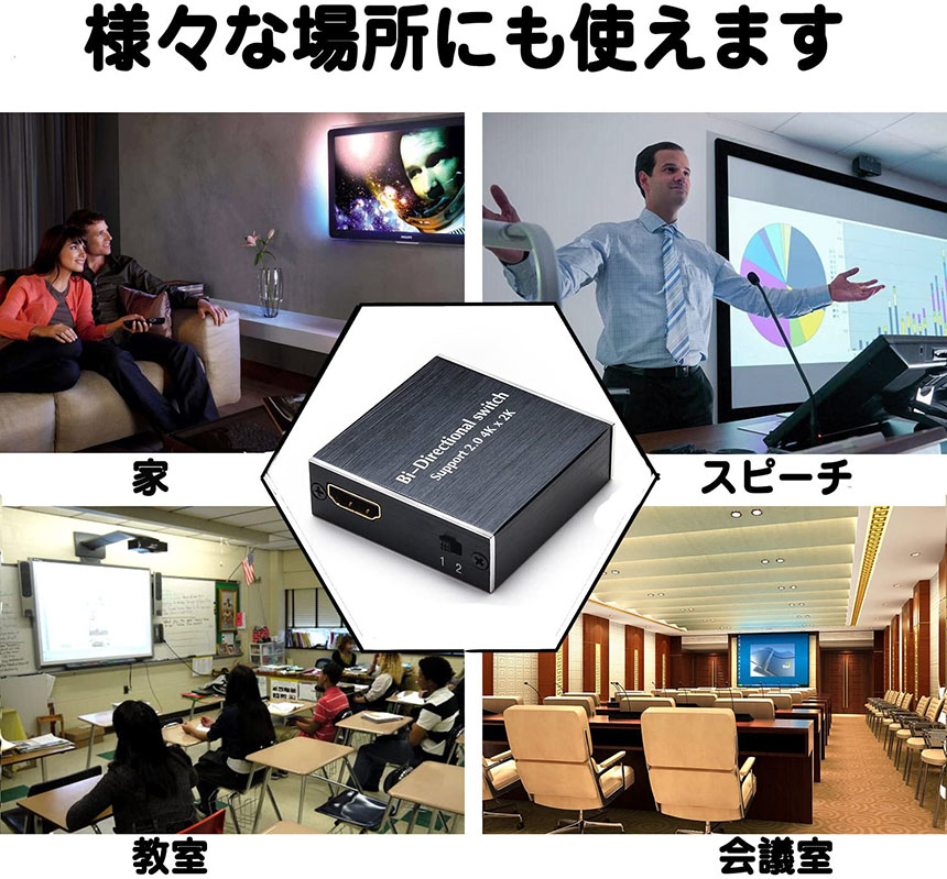 【1入2出&2入1出 双方向対応】 1台のHDMI入力機器を2台の出力機器 に切り替えて出力可能です。また、2台のHDMI入力機器のどちらかを1台の HDMI出力機器に切り替えて利用可能です。(注:2出力の場合に、2つの HDMIポートへ同時に出力することは出来ません。)
