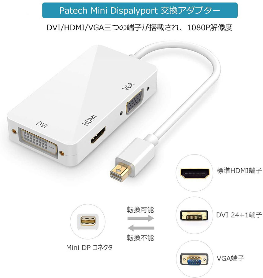 1.Mini DisplayPort (MiniDP)信号をDVI/HDMI/VGA信号に変換するだけです。逆方向変換出来ません。HDMIとVGAとDVI同時に出力ができません。
