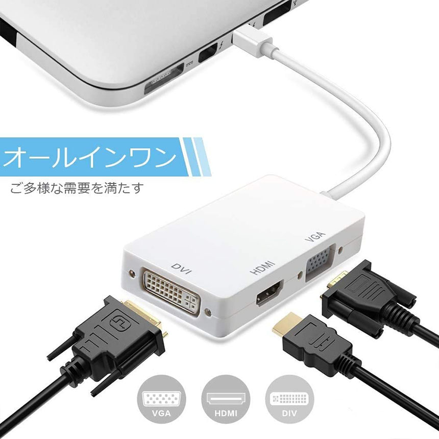 【3 in 1三種類出力】一つのMinidisplayのポートからDVI/HDMI/VGA3種類への出力に対応し、すごく便利な映像端子変換アダプターです。DVIとHDMI或いはVGAポートが付くHDTV、モニタ、プロジェクタ、LCD ディスプレイ等に接続するだけで、Mini DisplayPort (MiniDP)信号をDVI/HDMI/VGA信号に変換するアダプタです。