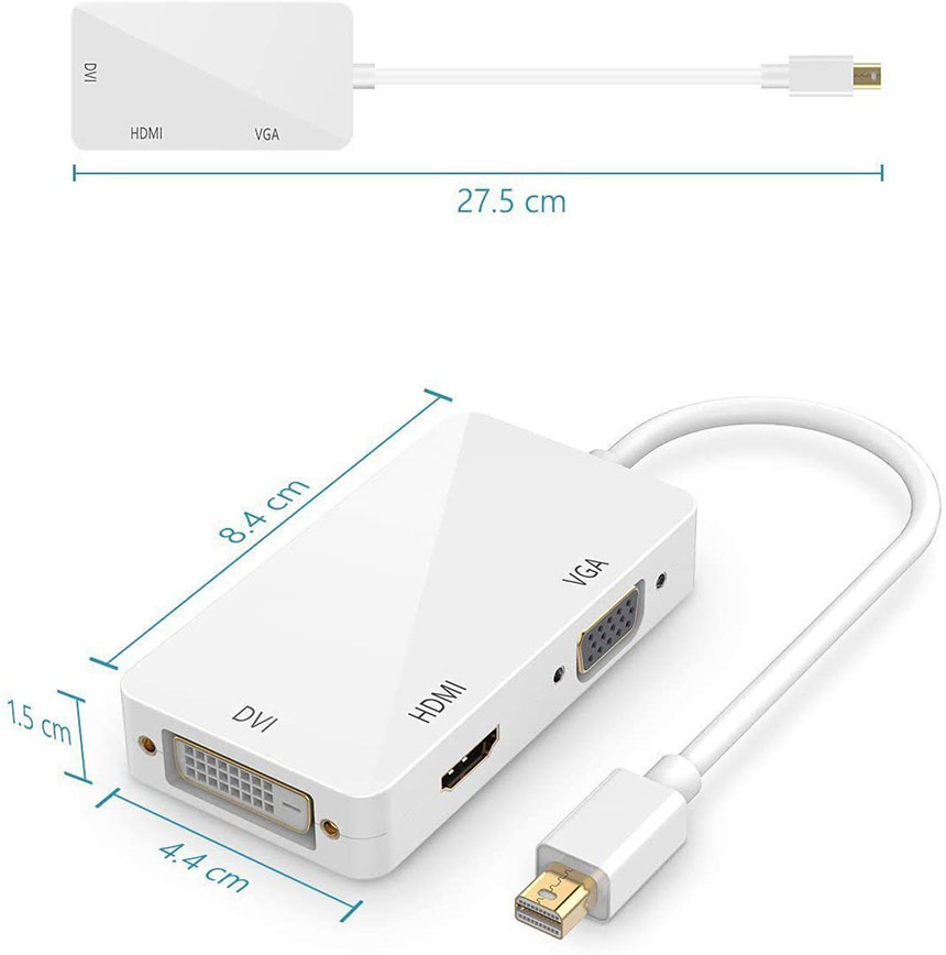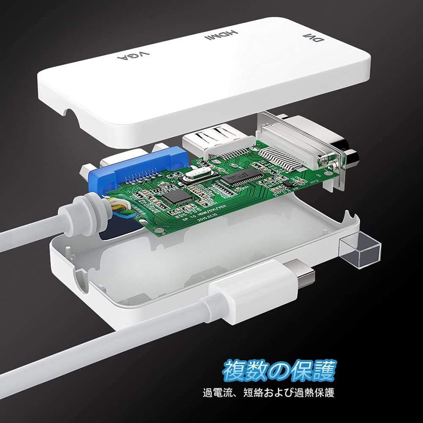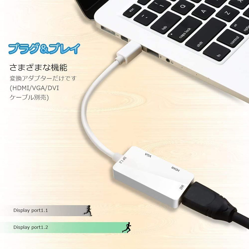 Mini DisplayPortをパソコンに差し込み、信号を入力します。アダプタからテレビやプロジェクターなどへHDMI/DVI/VGA対応もケーブル(付属品はHDMIケーブル)で信号を出力します。本製品の仕様ではメッキ処理を施したコネクタを採用しているため、通信パフォーマンスの向上はもとより、使用回数や年数の影響を極力軽減し、信号劣化が少ない仕様となっております。軽量とポータブルの設計でどこでも運び、使用上に非常に便利です。