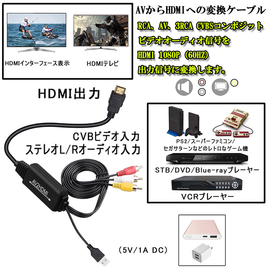 RCA to HDMI変換コンバーター コンポジットをHDMIに変換アダプタ av to hdmi変換ケーブル 1080P 720P対応 音声転送 HDM