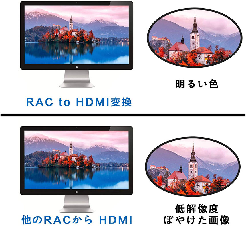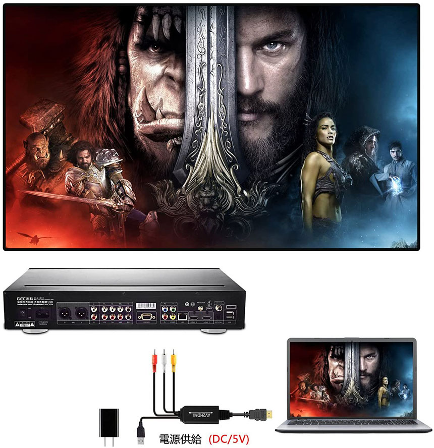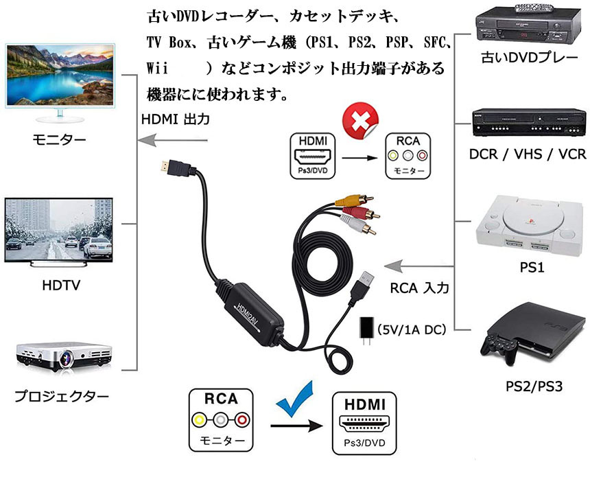 【avからhdmiへ変換】アナログ映像と音声をデジタル処理で高画質のHDMI映像と音声に変換することができます。古い機器の映像を新しいHDMIディスプレイで再生が可能です。PS2などのRCA出力を備えた機器からHDMI入力付きのディスプレイに接続して、RCA信号をHDMI信号に変更して出力することが可能です。*逆方向(HDMI to AV)にはご使用できません。