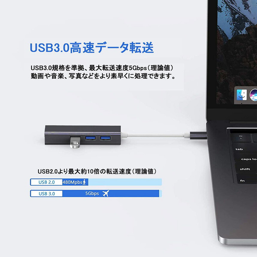 【USB C 有線LANアダプタ + USB3.0ハブ】USB Type Cコネクタで1000Mbps有線LANアダプターと最もよく使われるUSBポートをこの一本に揃えて、実用性が高い。