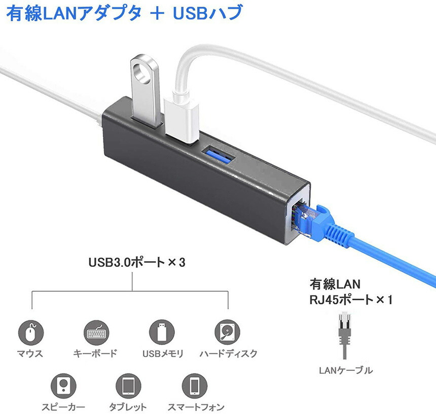 2).USB C 有線LANアダプタ + USB3.0ハブ:USB Type Cコネクタで1000Mbps有線LANアダプターと最もよく使われるUSBポートをこの一本に揃えて、実用性が高い。