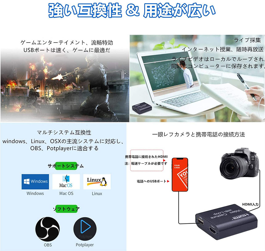 【強力な互換性】すべての1080P 720P hdmiデバイスと互換性があります 。 VLC、OBS、Amcapなどのほとんどの取得ソフトウェアをサポートします。Windows、Android、MacOSのサポート。 USBビデオおよびUVC標準に準拠。 USBオーディオUAC規格に準拠。