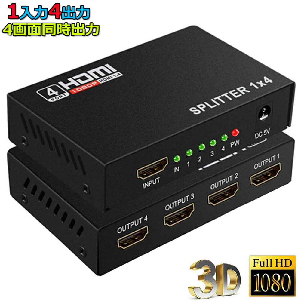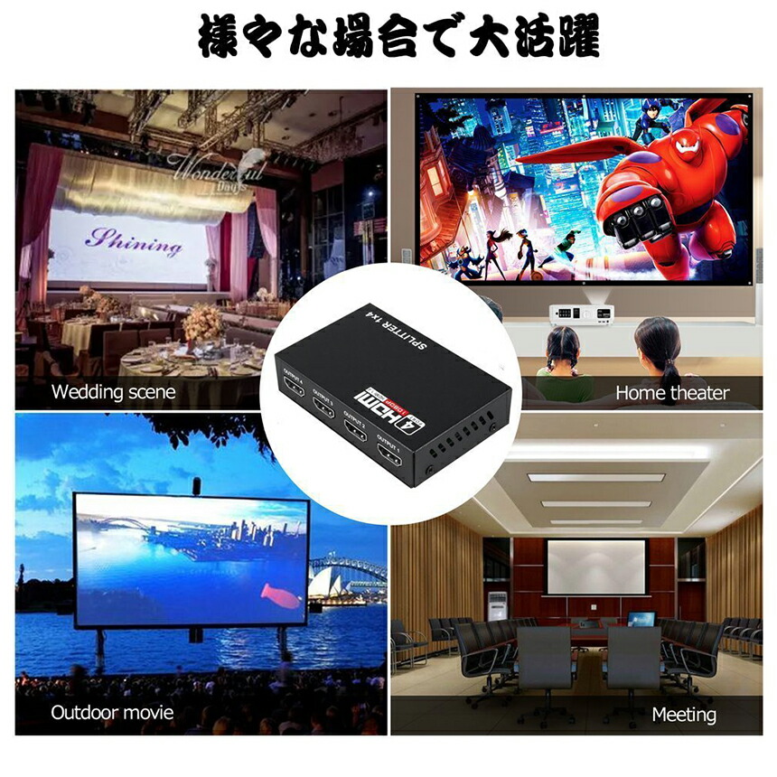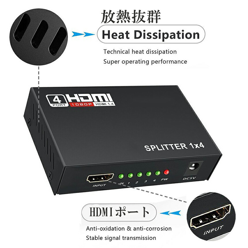 一台のHDMI出力端子付きプレーヤー(ブルーレイ、DVD、PC、PS3、PS4など)の映像と音声信号を、4台のHDMI搭載液晶テレビやモニタに出力可能な分配器です。