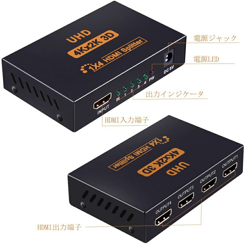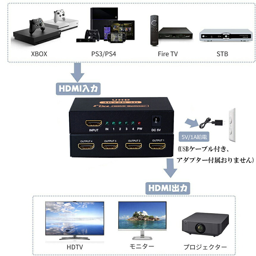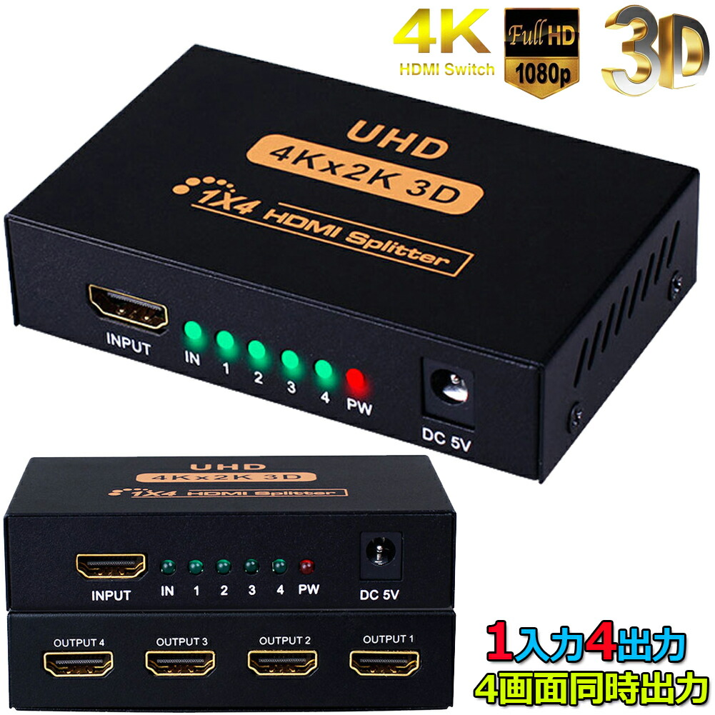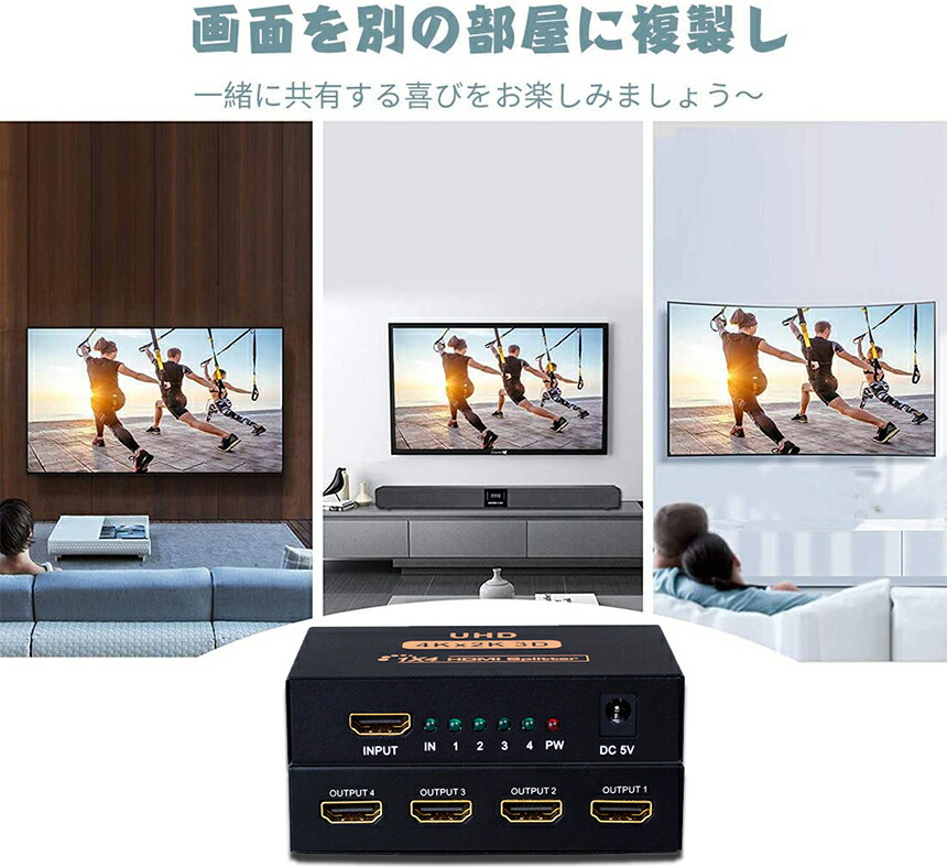 一台のHDMI出力端子付きプレーヤー(ブルーレイ、DVD、PC、PS3、PS4など)の映像と音声信号を、4台のHDMI搭載液晶テレビやモニタに出力可能な分配器です。
