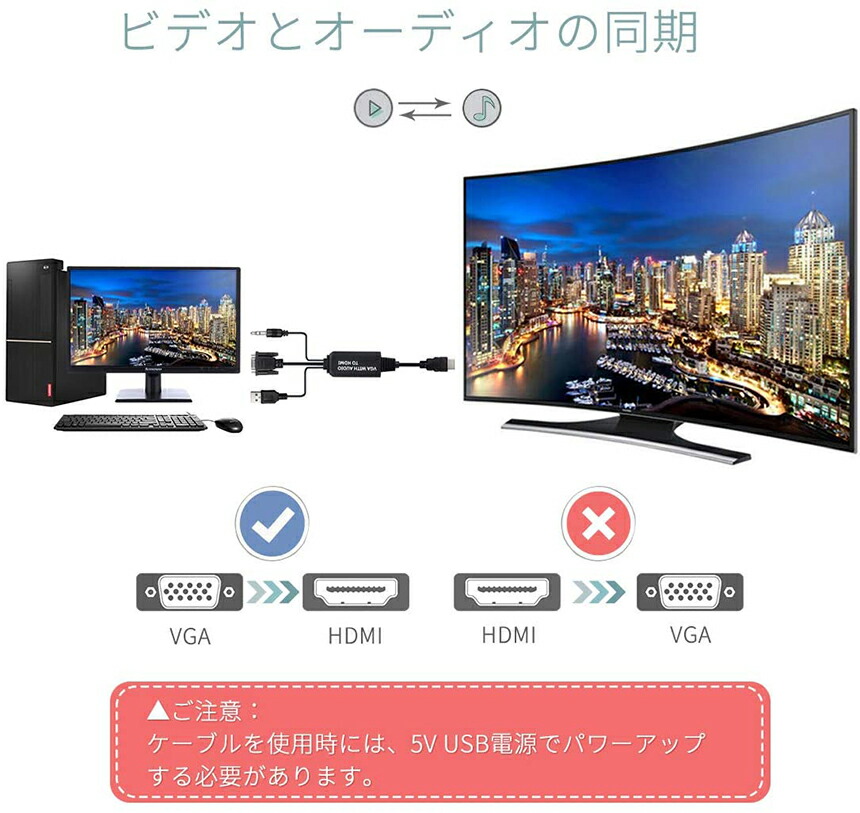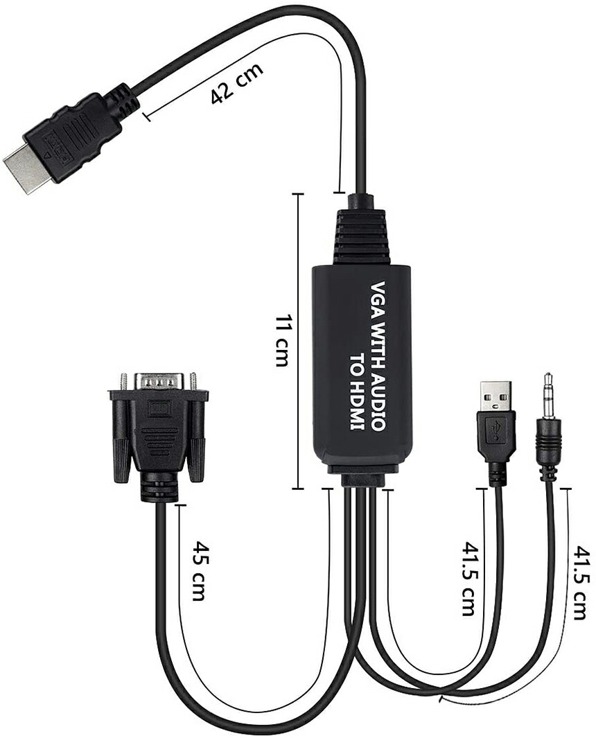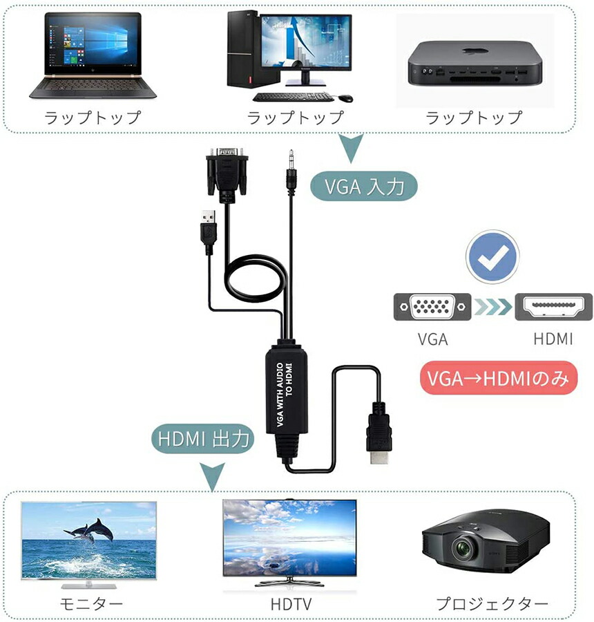 【VGAからHDMIのみ】このVGAからHDMIへの変換ケーブルは一方向の設計です。VGA(PC /ラップトップ/ HD TVボックスなどのアナログ信号出力)からHDMI(モニター、HDTV、プロジェクターなどのデジタル信号入力)に変換するだけです。HDMI-VGA変換ケーブルとしては使用できません。