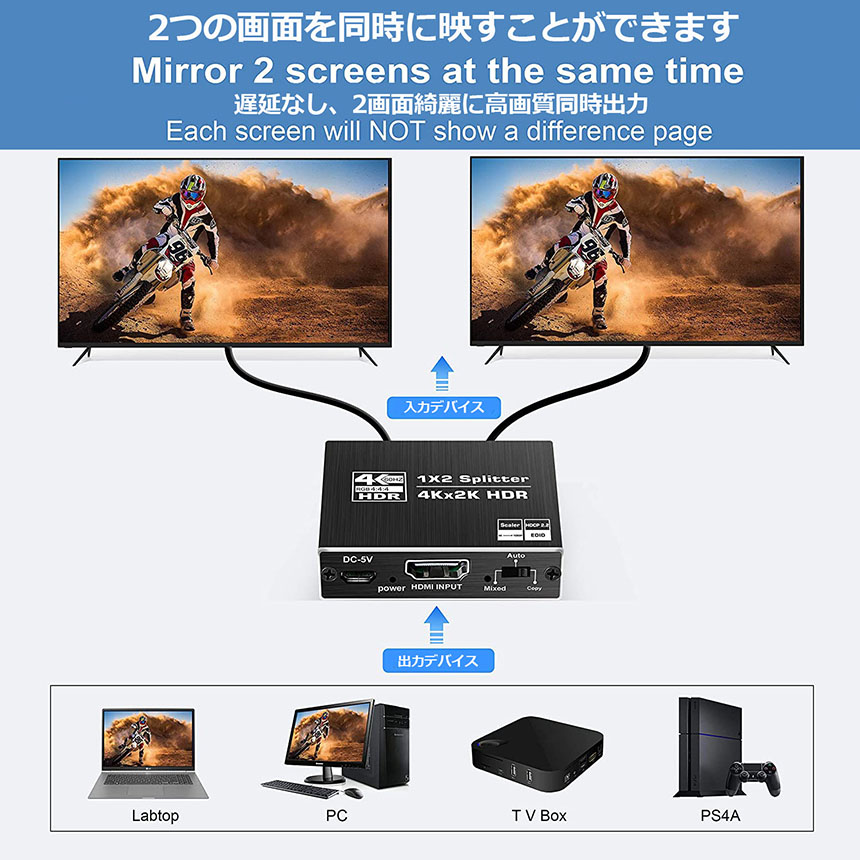 【幅広い互換性】最新のHDMIスプリッターチップを使用したこのHDMIスプリッター1入力2出力4k@60hzは、Blu-ray / DVD / HDプレーヤー、ケーブル/衛星ボックス、Amazon Fire TV、 Apple TV、PS3 / PS4 / PS5、Xbox、PC /ラップトップ、HDカメラ、HDDVRなど。