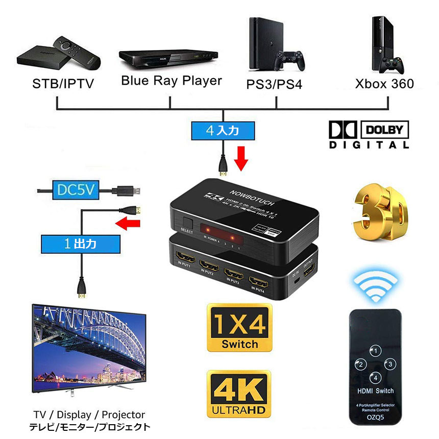 【HDMI切替器4入力1出力】本4ポートHDMI切替器は、4台のHDMI機器の映像・音声を切り替えて1台のテレビ/プロジェクターに出力ができるものです。即ち、テレビのHDMI入力端子が不足していても、ケーブルの差し替えをせずにHDMI機器を利用可能です。ホームシアター、オフィス、学校、会議室、ショッピングセンター、ホテルや博物館などに最適です。