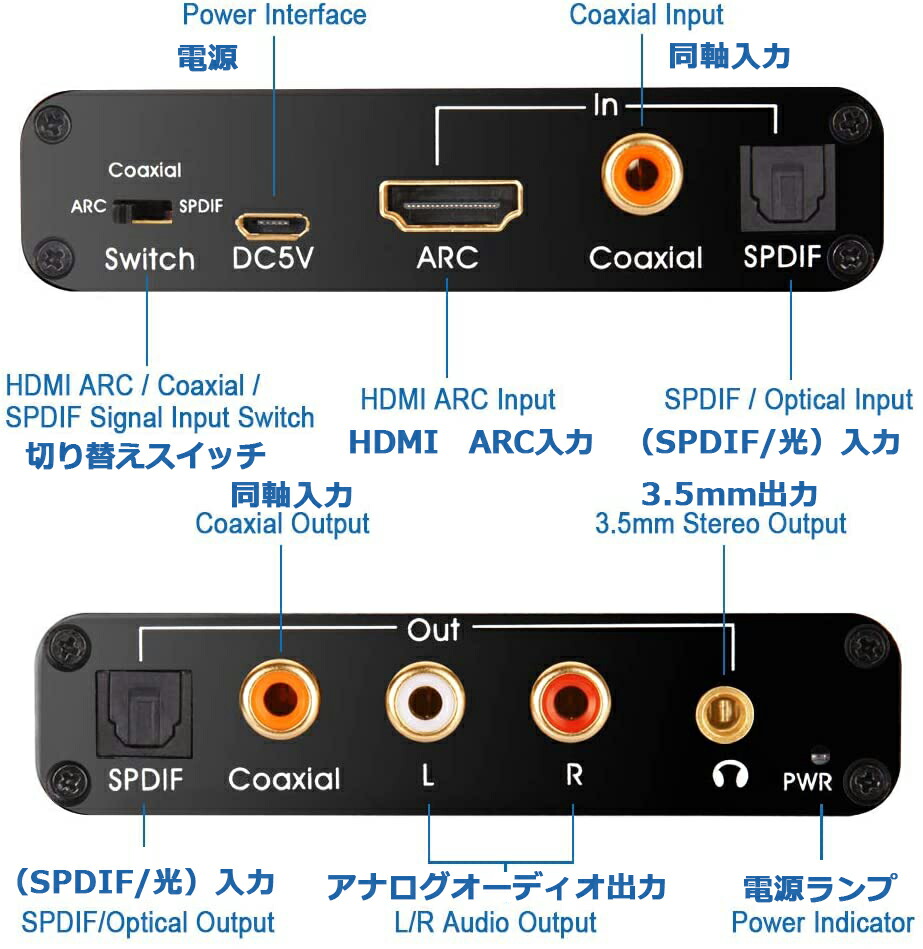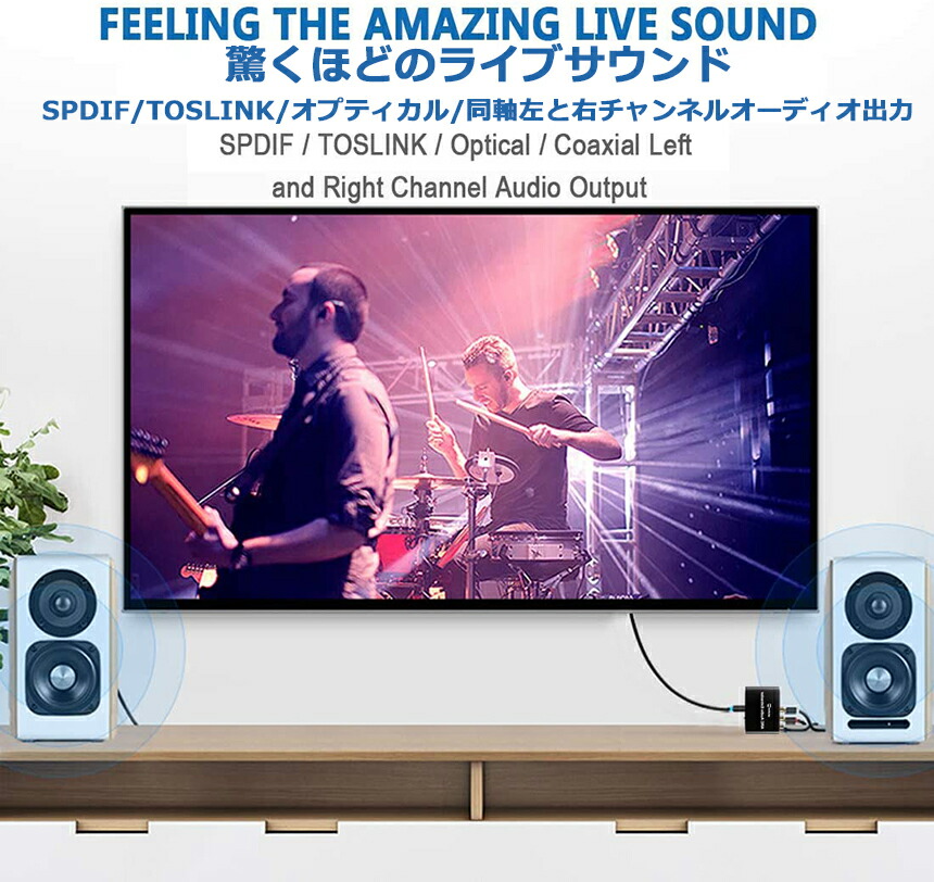 【複数種類のオーディオ出力】HDMI /同軸/ SPDIFから同軸+ SPDIF + RCA(L / R)ステレオアナログオーディオ+ 3.5mmオーディオ出力可能。Optical Toslinkは、着信2.0CH、5.1CH Dolby Digital、DTSをサポートします(注:Dolby Digital Plus以降はサポートしていません)。RCA L / Rおよび3.5mmオーディオ出力は、着信2.0CHステレオオーディオのみをサポートします。