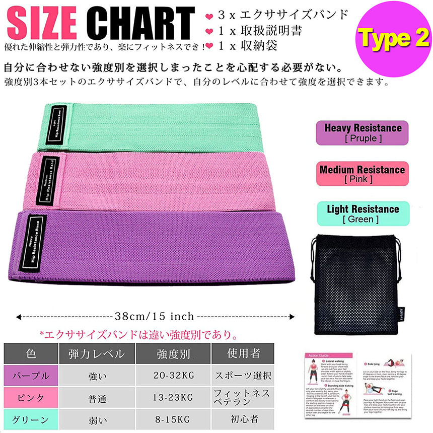 Type 2:◆弱い:グリーン(8-15KG)◆普通:ピンク(13-23KG)◆強い:パープル(20-32KG)。