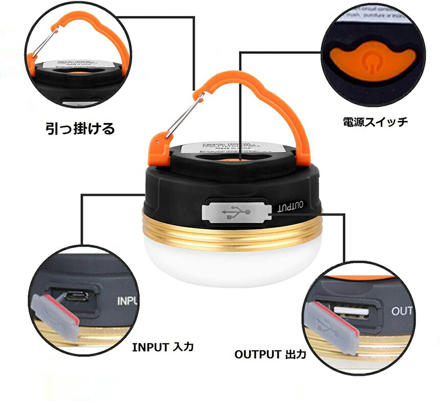 【電球色のLEDランタン】:太陽や炎のように陽気で暖かなオレンジ色の電球を採用、お部屋での普段使いから、アウトドアシーンや緊急時まで、様々な場面で活躍する優れもの。USB給電ライプで、USBケープルを接続して充電可能。1800mahのリチウム電池が内蔵されており、長時間点灯可能となります。*電源指示灯のランプが緑色点滅→充電中、緑色点灯→充電完了、赤色点灯→点灯中。