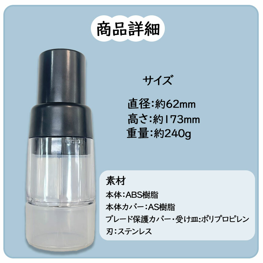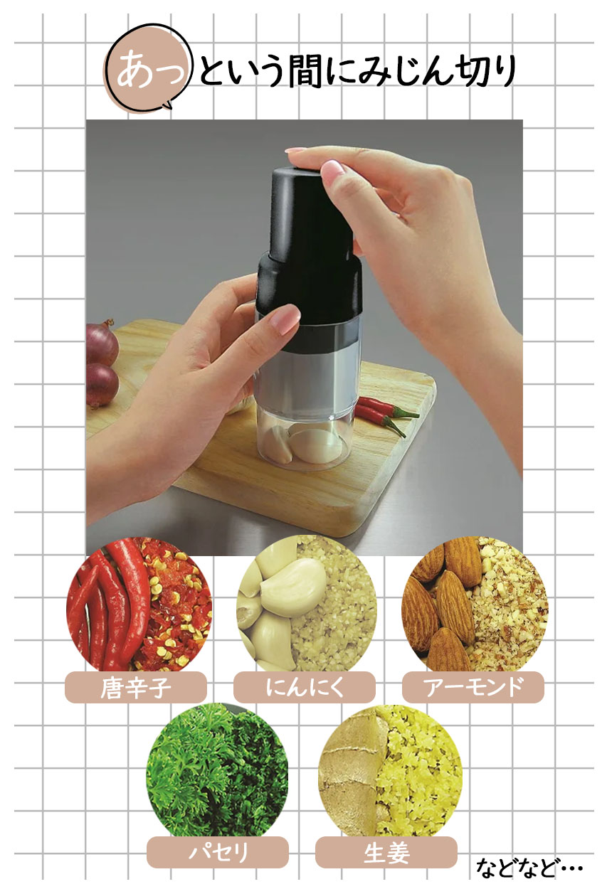 ちょっとした食材を細かくカット!コンパクトで電池いらず、部品も細かく取り外しが可能なので清潔にお使いいただけます。