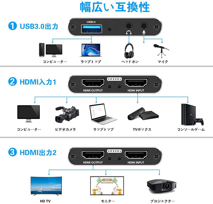 互換性のあるデバイス:Wii U、PS4、PS3、Xbox One、Xbox 360、Wii、Nintendo Switch、DVD、カメラ、ZOSI防犯カメラ、DSLR、セットトップボックスなどのゲームコンソールのHDMI入力機能のみに対応します。