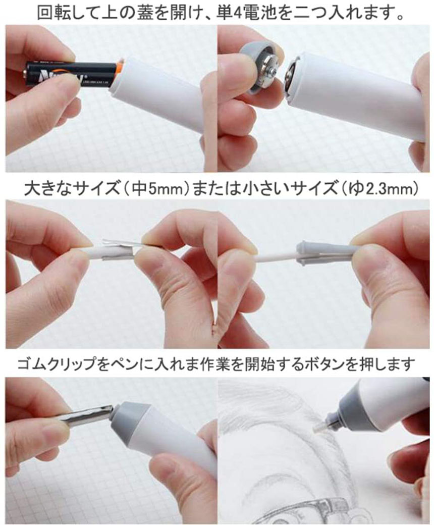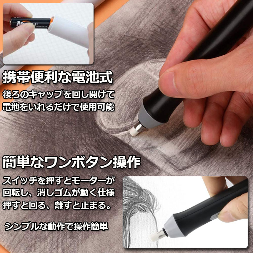 ワンボタン操作:指で、スイッチを押している間モーターが回転して、消しゴムが動く仕組みになっています。押すと動き、離すと止まるというシンプルな動作で余分なところまで消しすぎることなく、狙ったところを意図通りに消すことができる字消し器です。