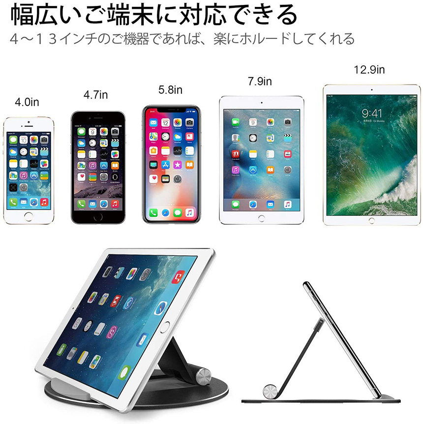 【角度調整可能・安定性バツグン】180度調整可能で、ご自身に最適な視野角で画面を見やすいです。円形な土台やラバー滑り止めマットにより、 ご端末を保護し、傷つけにくくなっている一方、重心が低く、単に置けるレベルではなく、操作しても全然グラつかなく、しっかりホルードしてくれる安定性に優れています。