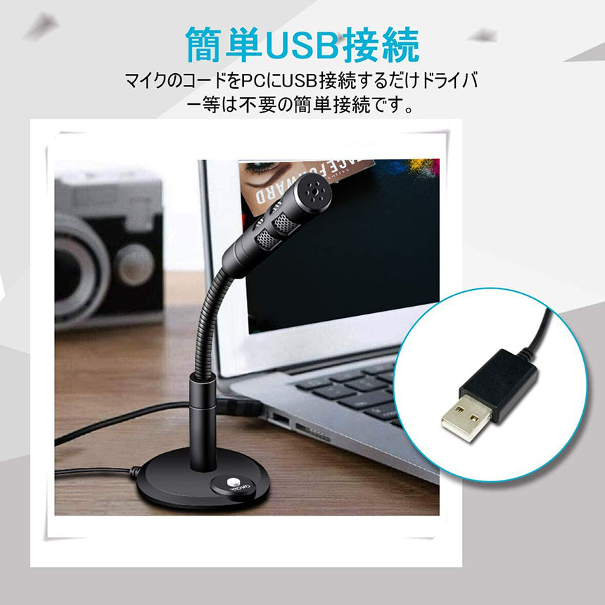 【USB簡単接続のパソコン マイク】プラグアンドプレイ式のコンデンサーマイクpc 、ドライバのインストール必要が無く、 PCのUSBポートに差し込むだけで使えます。Mac OS X Windows Linux などすべてのOSに対応。