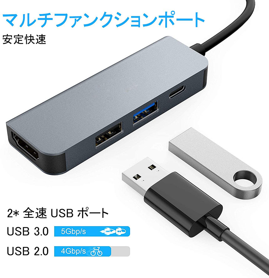 【USB Type C ハブ】4ポートが揃っているドッキングステーションです。USB3.0ポート*1、USB2.0ポート*1、HDMIポート*1、PD充電ポート*1を備えます、複数のデバイスを繋いでも安定に動作します。Type-Cインターフェースはコンピュータまたは携帯電話に対応し、同一画面でオーディオとビデオ、テキストファイルデータを読み込めます。