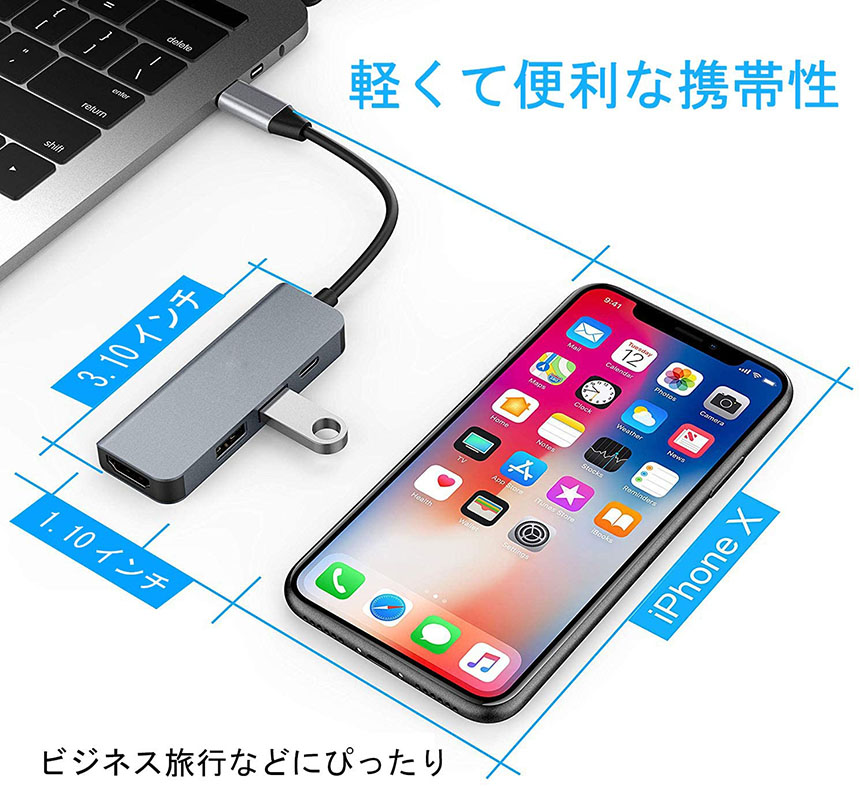 ◆このハブはUSB3.0ポート*1、USB2.0ポート*1、HDMIポート*1、PD充電ポート*1を備えます
