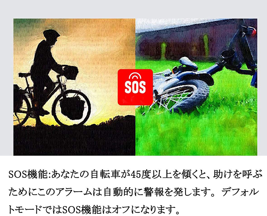 非警戒状態でSOS機能をONにすると、トラブルで自転車が45度以上傾いている場合、本体は音が鳴り、助けを求める。