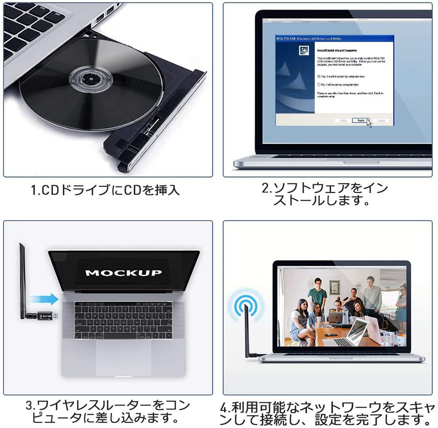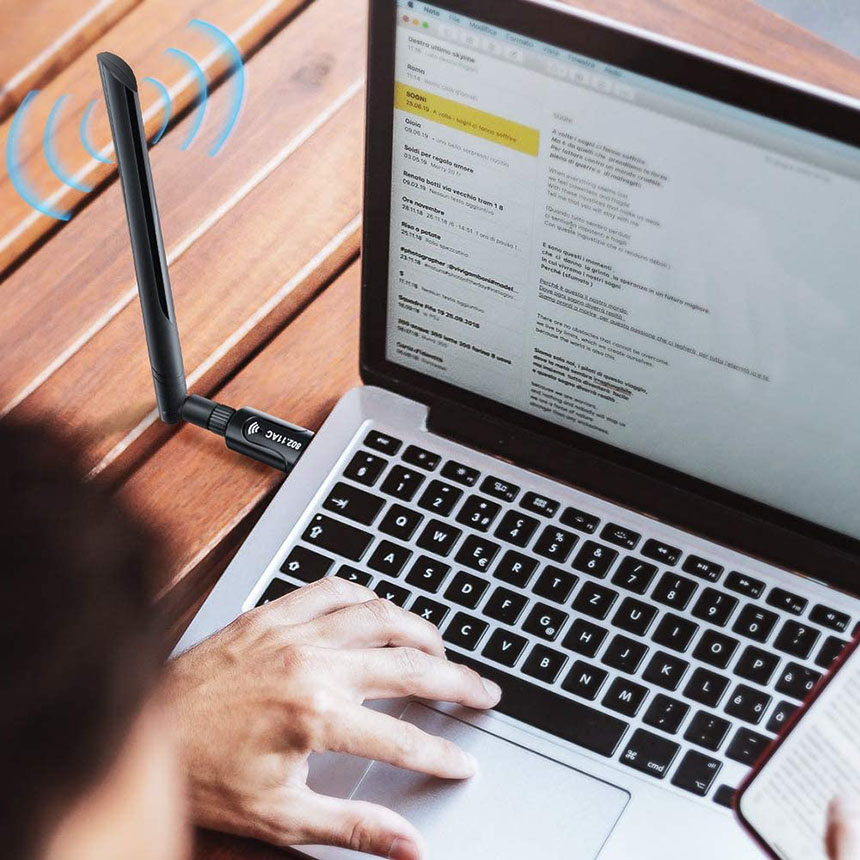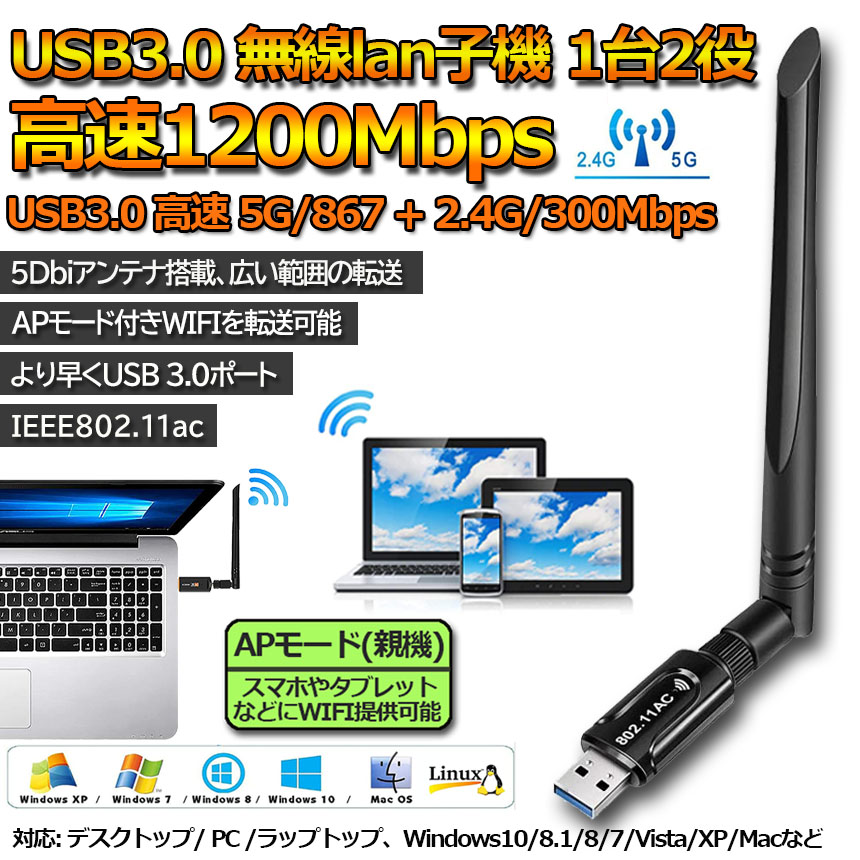 【USB 3.0ポート・高速通信】USB 3.0はUSB 2.0より10倍速くて、最高のスループット性能とWi-Fiアダプタ用のより安定したインターネット接続を提供します。本無線LAN子機は最大5GHz帯(867Mbps)+2.4 GHz帯(300Mbps)の超高速接続、最高1200Mbpsで通信可能になります。大容量データを短時間でイライラする事無く転送出来ることを実現する。