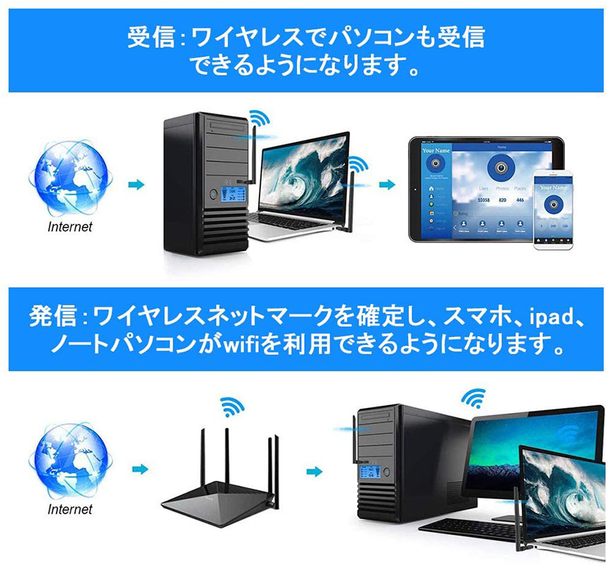 【11ac技術・ デュアルバンド】デュアルバンドで高速通信、接続デバイスが増えると通信速度が低下します。wifi usbはルーターとの距離が近く、またビデオやオンラインゲームをする場合、5Gバンドを勧めです。無線 LAN 子機はルーターとの距離が遠く、またウェブサイトをサーフィンしたい場合、2.4Gを勧めです。