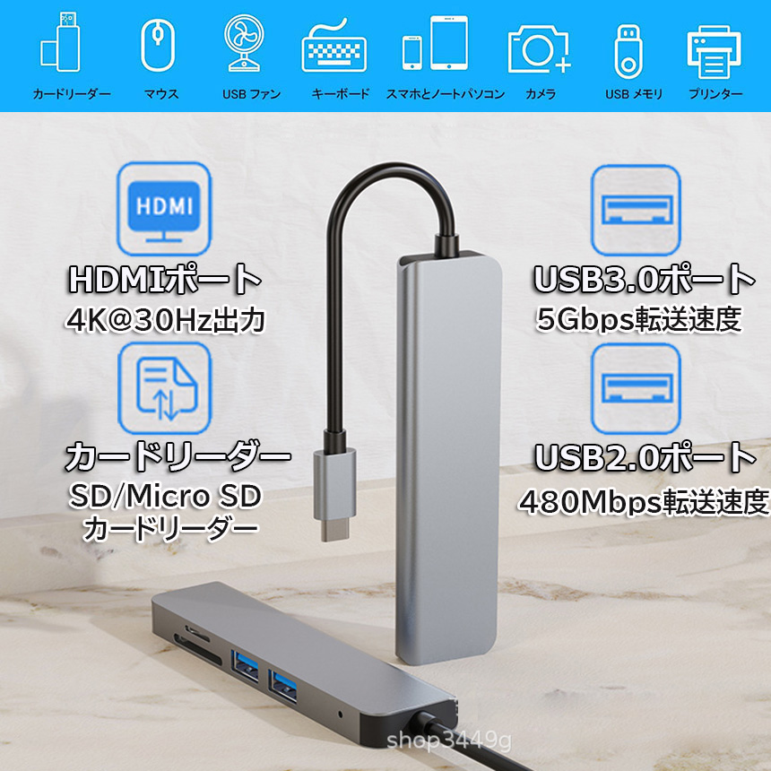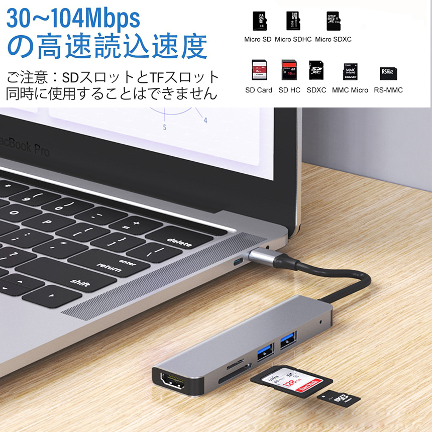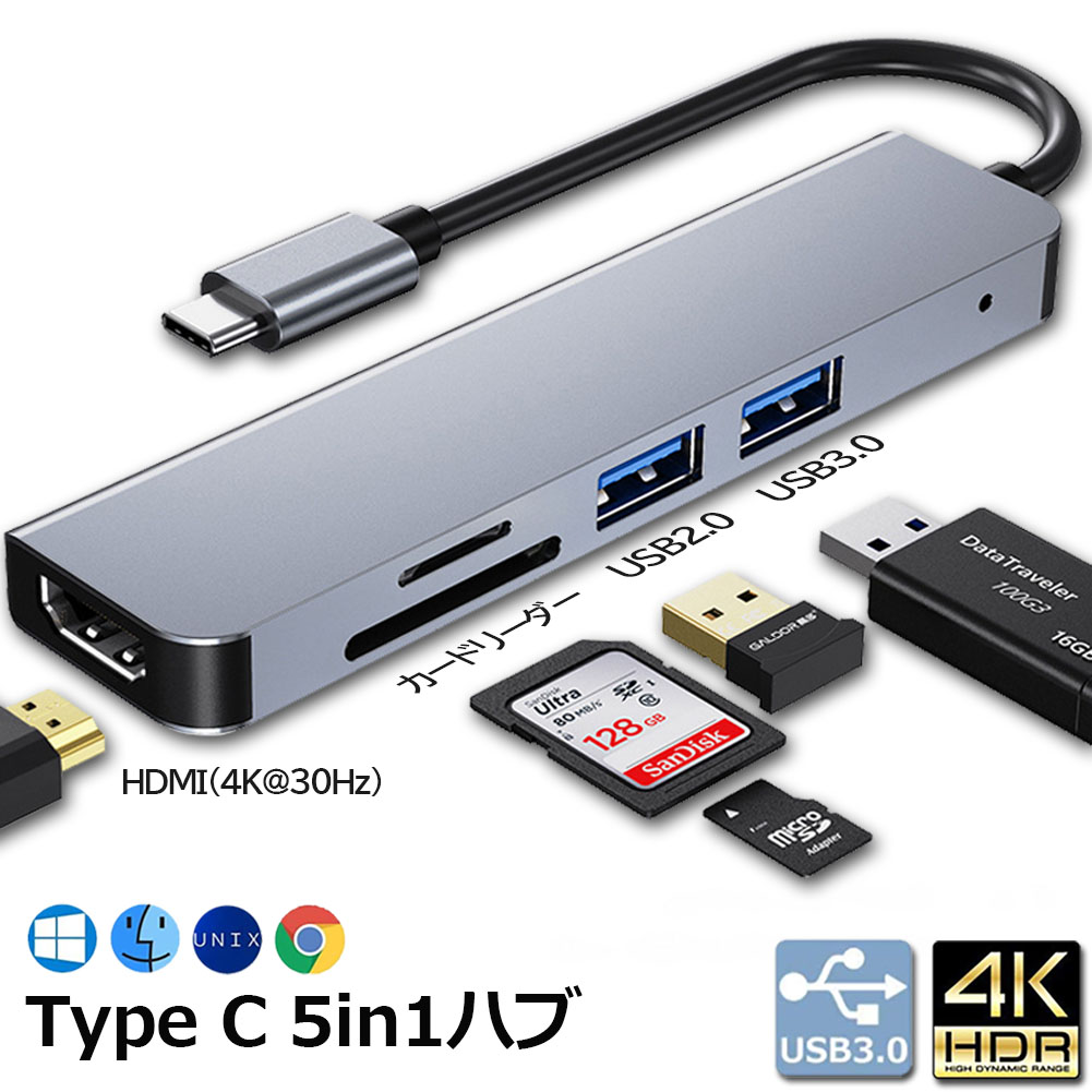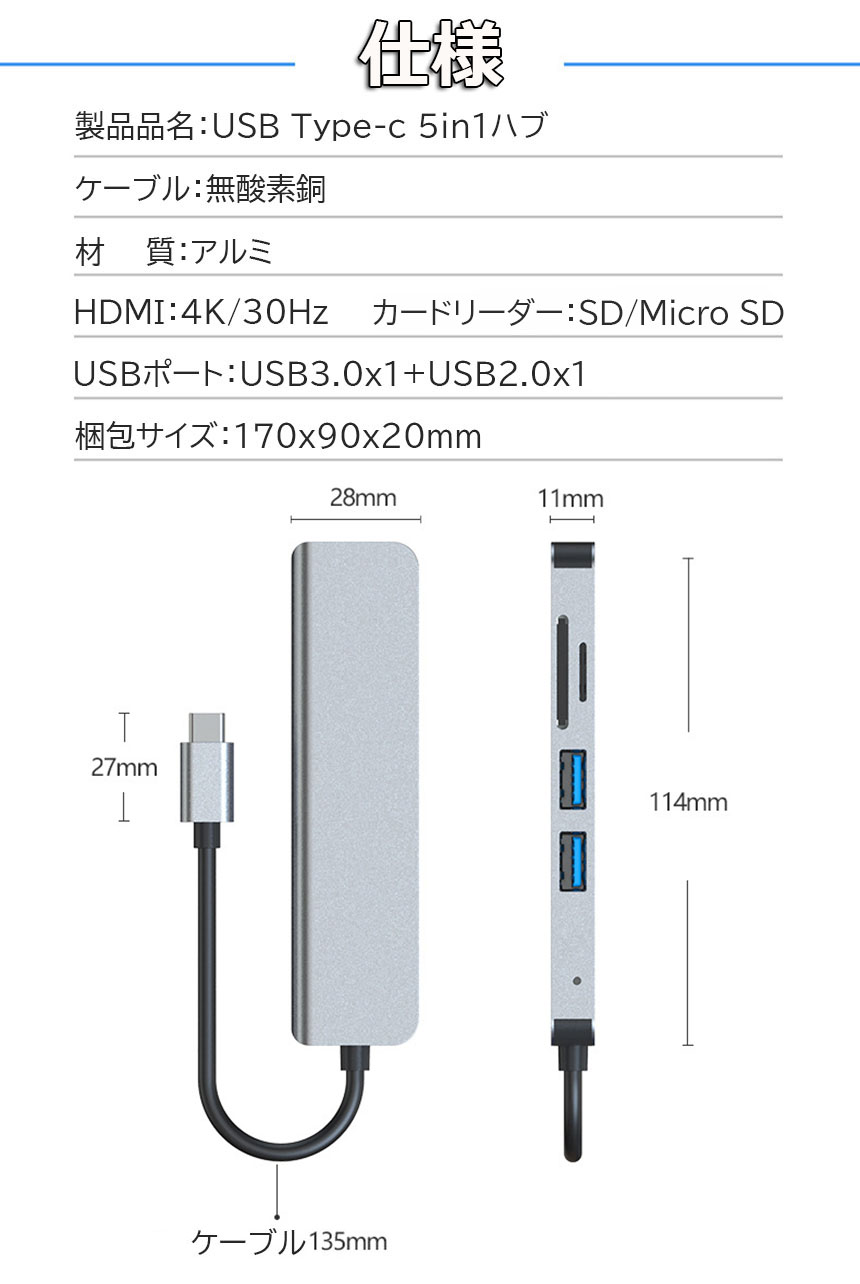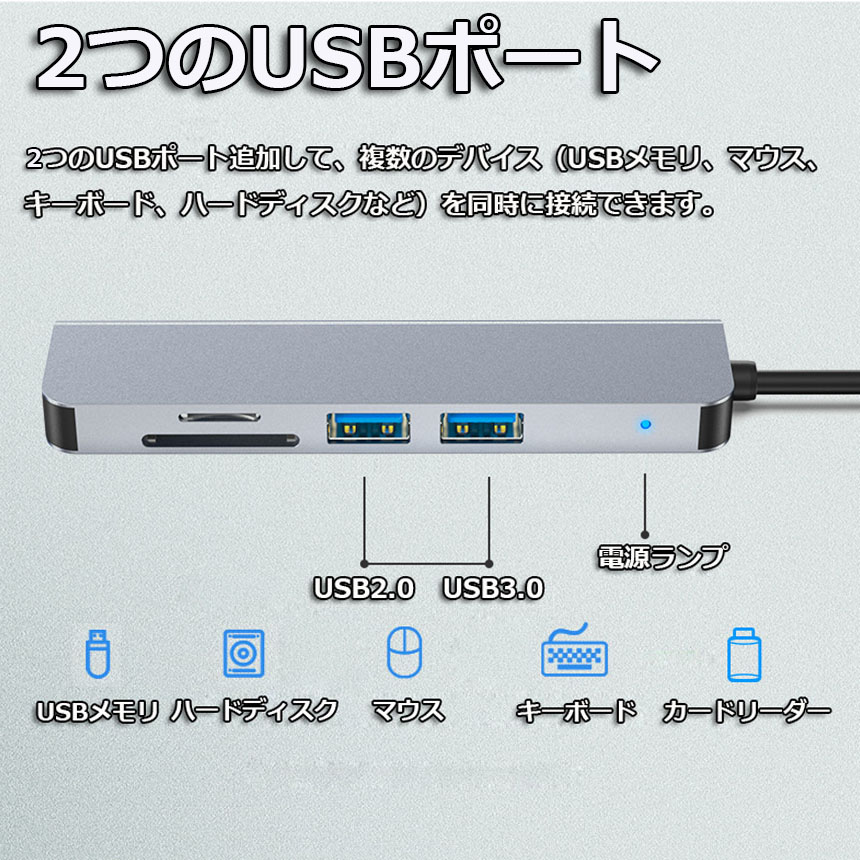 【USB Type C ハブ】5ポートが揃っているドッキングステーションです。USB3.0ポート*1、USB2.0ポート*1、HDMIポート*1、SD/Micro SDカードリーダーを備えます、複数のデバイスを繋いでも安定に動作します。Type-Cインターフェースはコンピュータまたはスマホに対応し、同一画面でオーディオとビデオ、テキストファイルデータを読み込めます。