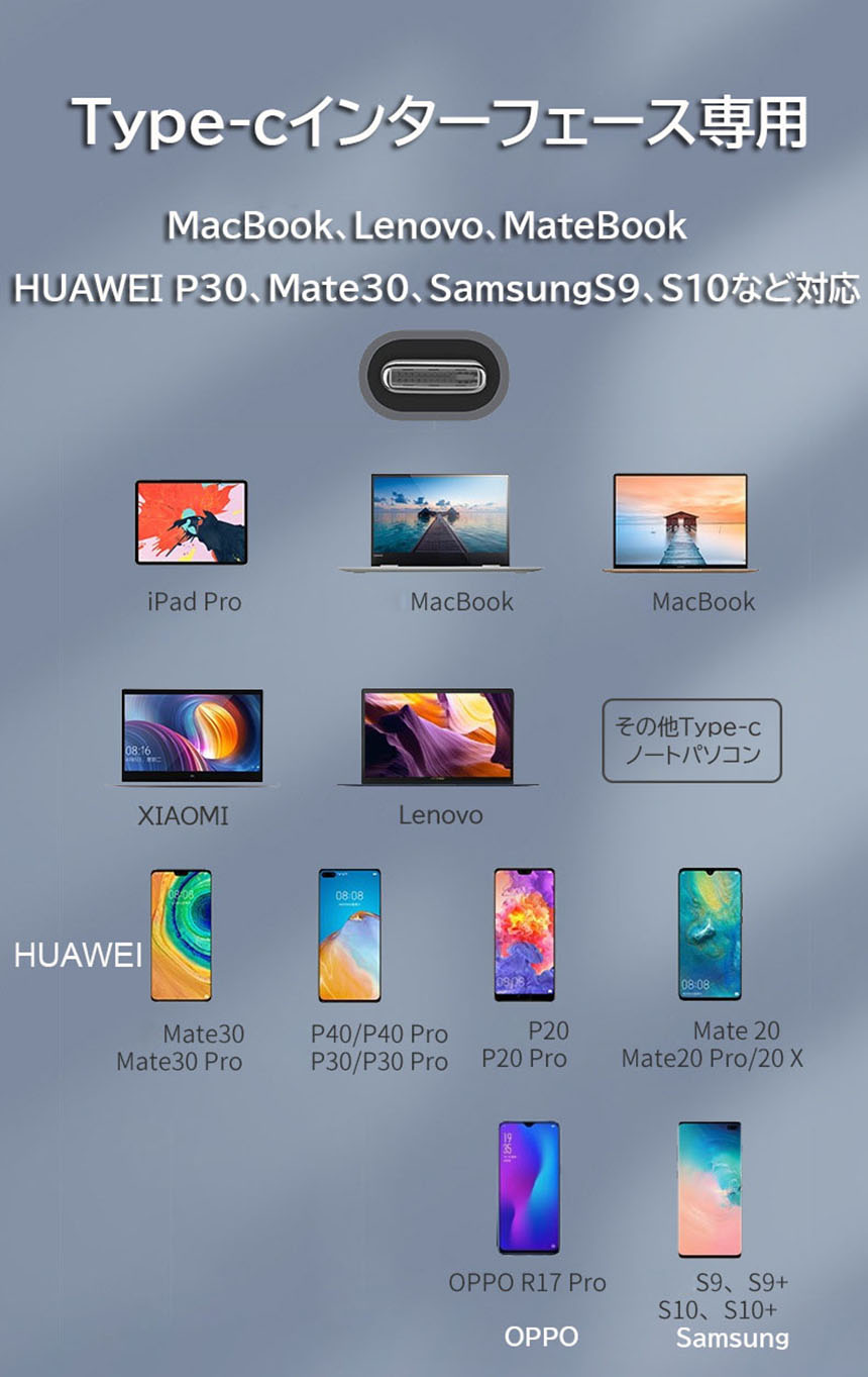 【互換デバイス】新しいノートパソコンやUSB Cポート付きのスマートデバイス:MacBook 12“ / MacBook Pro、Mate Book X、mi Air 12.5/13.3、Google chrome-book 2016などが対応しています。