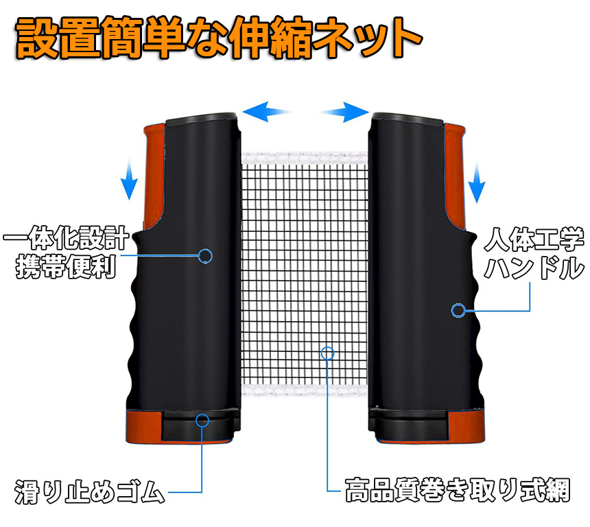 【携帯型伸縮ネットラック仕様】卓球セットネットの長さ(横幅)は可変式なので、本格的なプレーを楽しむことも、お子様用に小さな台を作ってあげることも可能です。材質:PEプラスチック、人体工学の応力ハンドル+高度変形防止ネットラック+リバウンドボタンを採用しております。【セット内容】ラケット2本、伸縮ネットラック1本、ボール6個、収納バッグ。