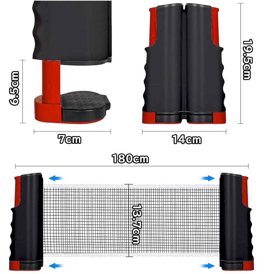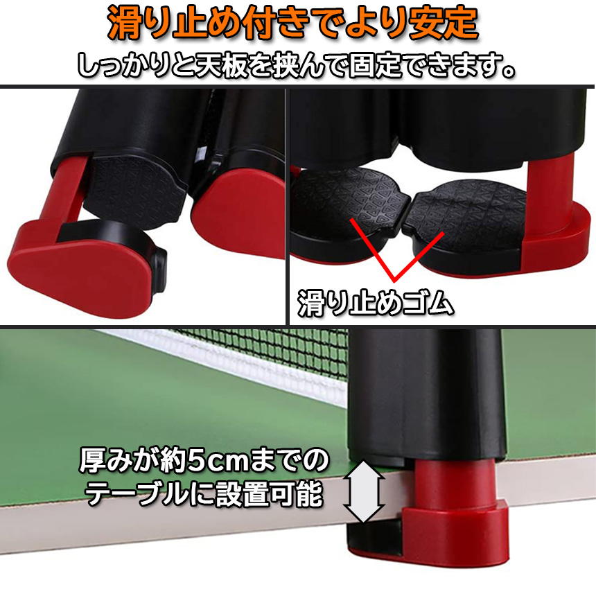【テーブルさえあれば簡単設置】卓球台は要らない、テーブルだけあれば、簡単にセットして卓球を楽しめるポータブルネットです。グリップ機構の支柱で天板を挟んで固定します。ネットの伸縮サイズは最長約180cm、厚さ約5cmまでのテーブルに設置可能。わざわざ卓球館に行かなくても、家にいても卓球を楽しむことができます。