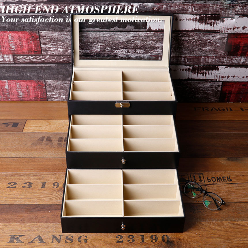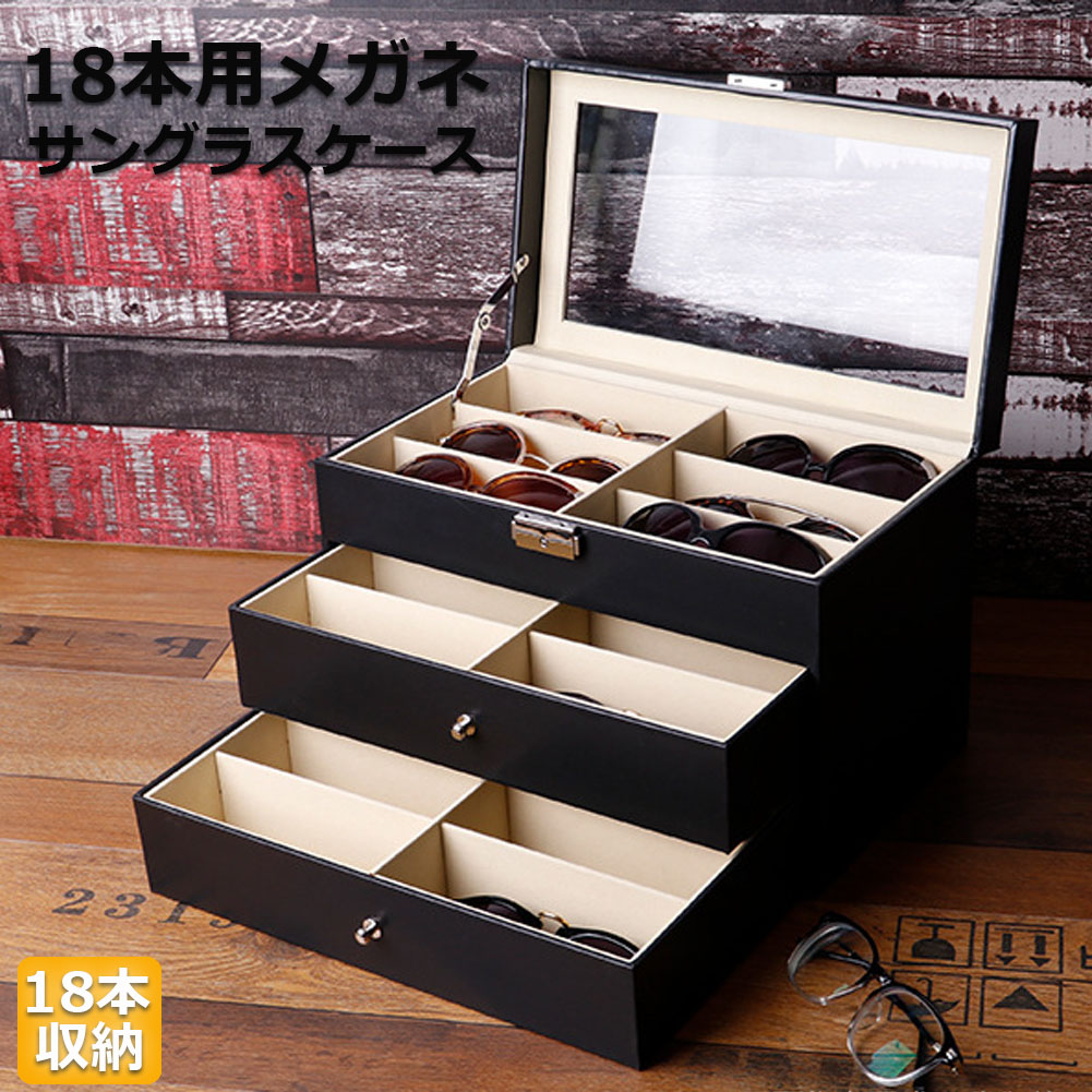 【サイズ】サイズ:33.5x19.5x22.5cm。本体重量:1900g,素材:PUレザー、ベルベット・他。メガネやサングラスを最大18本収納できるコレクションボックスです。