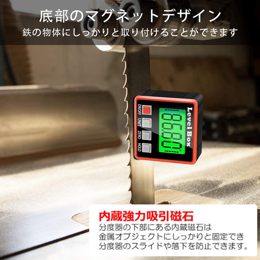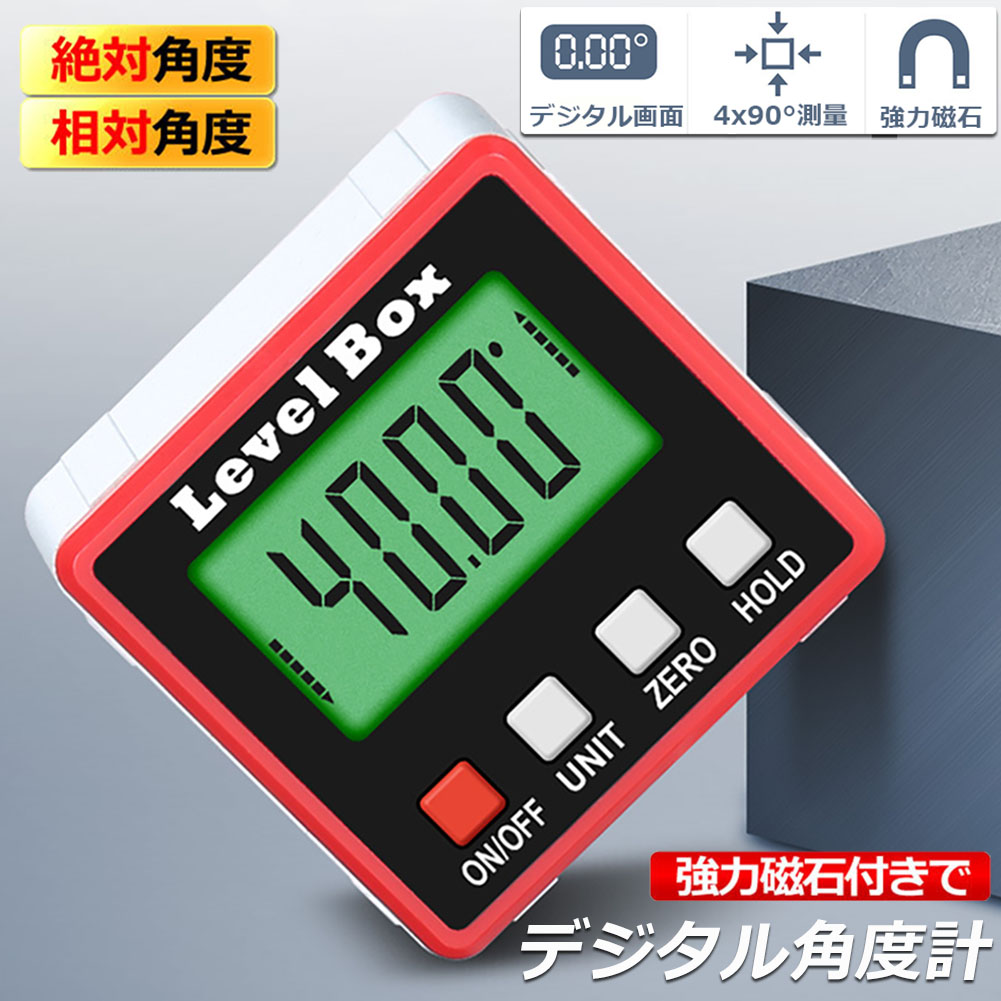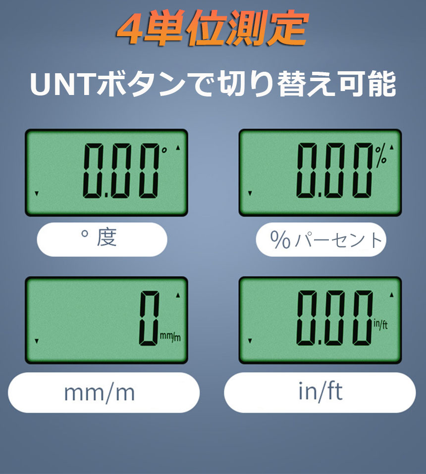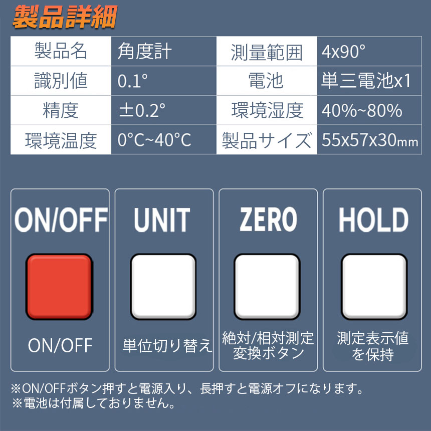 【高精度でシンプルな操作】:最大測定範囲:4 * 90°(0-360°);精度:0.1°。 測定表示単位(°、%、mm / m、in / ft)は、実際のニーズに応じて、装置のUNITキーを介して自由に切り替えることができます。 ZEROキーで任意の位置にゼロを設定でき、絶対角度、相対角度を測定できます。 HOLDキーはワンクリックでデータを保持できます。