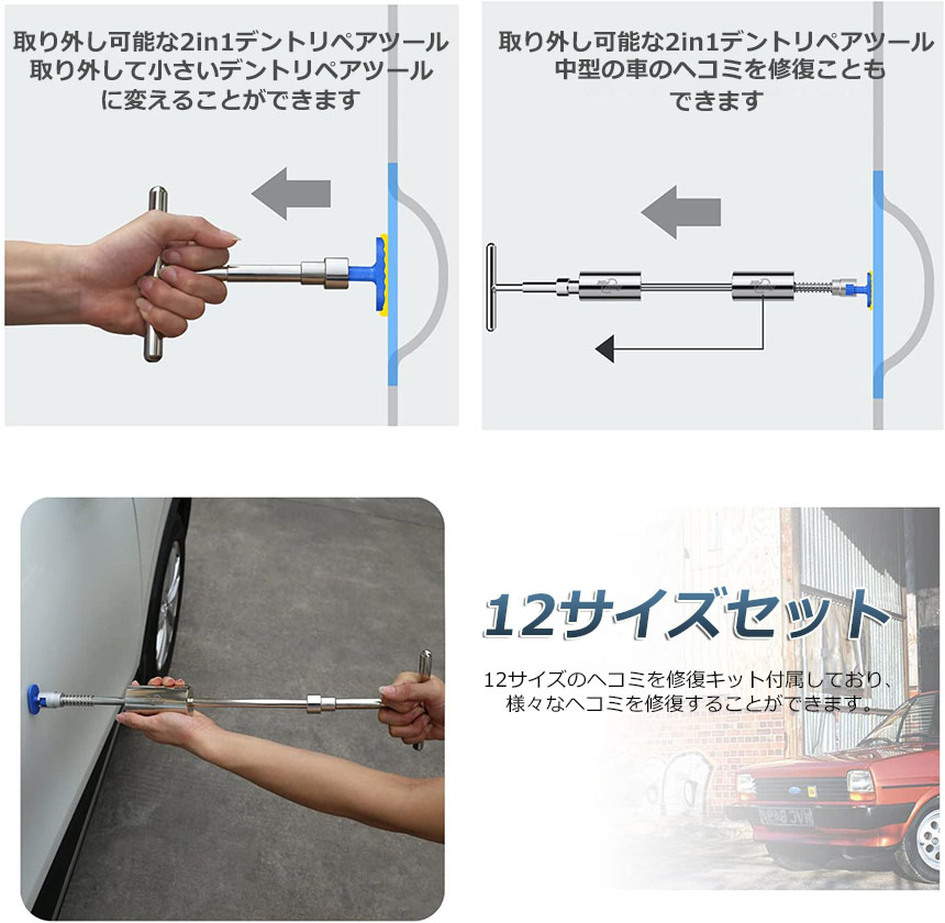 【使用簡単】修理工場の普通修理は数日間が掛かりますが、今はそなん必要がなく、自分で簡単に作業し、短時間で凹み直しが可能です。気になる凹みをパテも塗料も使わず簡単に補修が出来ます。愛車を綺麗に手入れします。