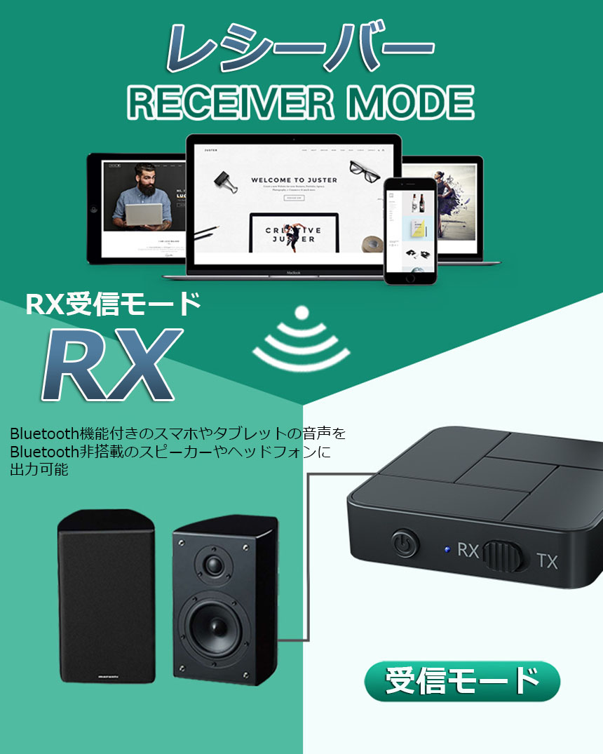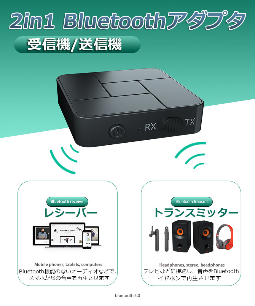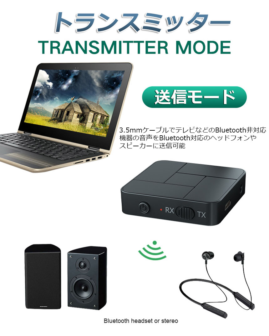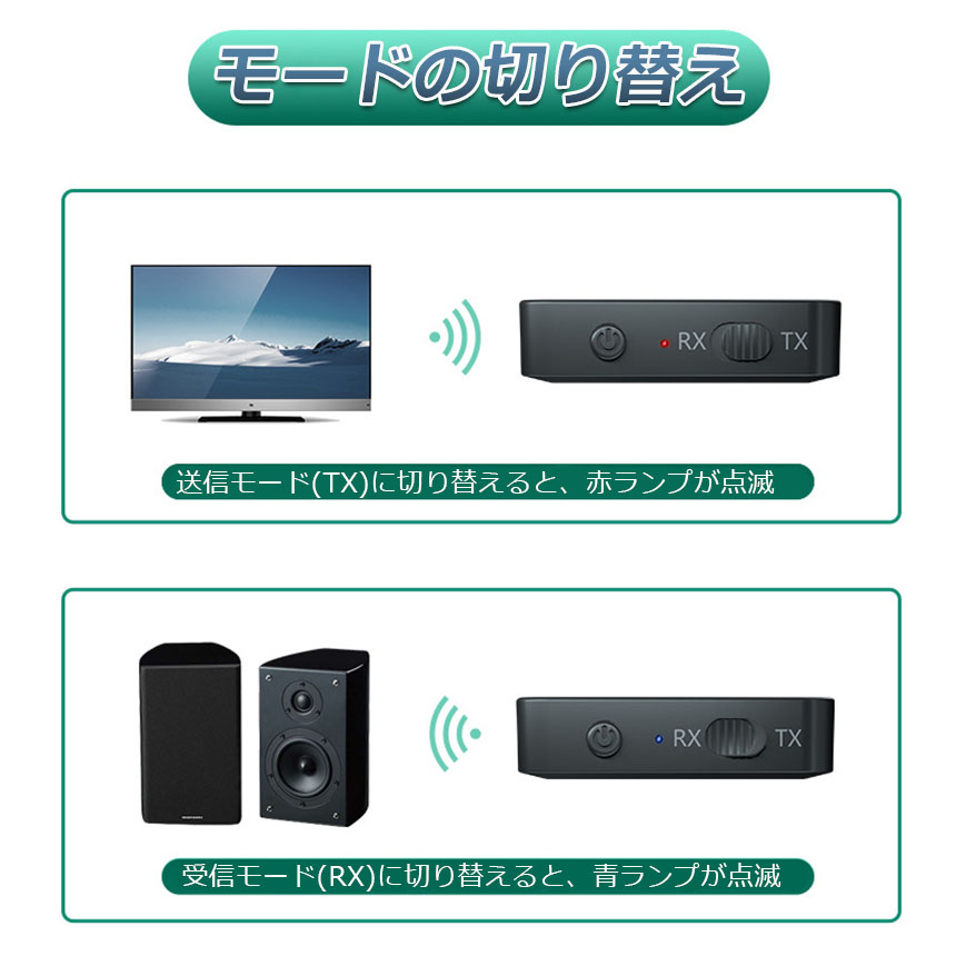【一台二役】本製品は送信と受信の両方に使用可能なBluetoothオーディオトランスミッター&Bluetoothオーディオレシーバーです。送信機モードや受信機モードはワンタッチで簡単切替えできます。送信機(TXモード):Bluetoothに対応していない携帯オーディオプレイヤーやテレビと繋いで、Bluetooth対応のスピーカーやヘッドセットなどと接続ができます。受信機(RXモード):Bluetoothに対応していないイヤホンやヘッドホンを繋いで、Bluetooth対応のスマートフォンや携帯オーディオプレイヤーなどと接続ができます。※通話はできます。