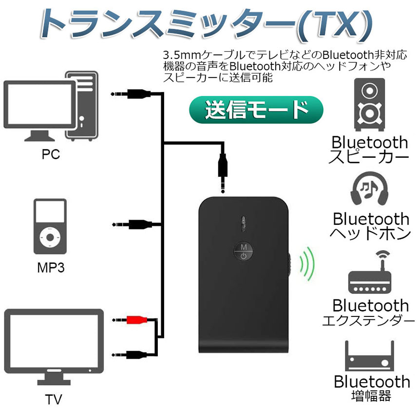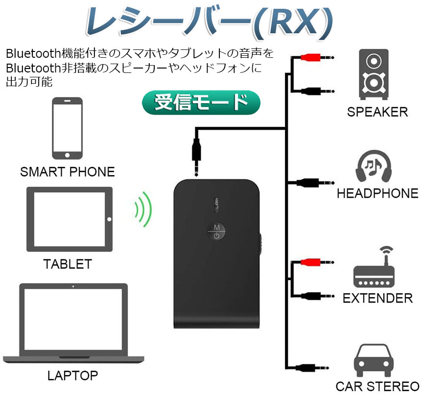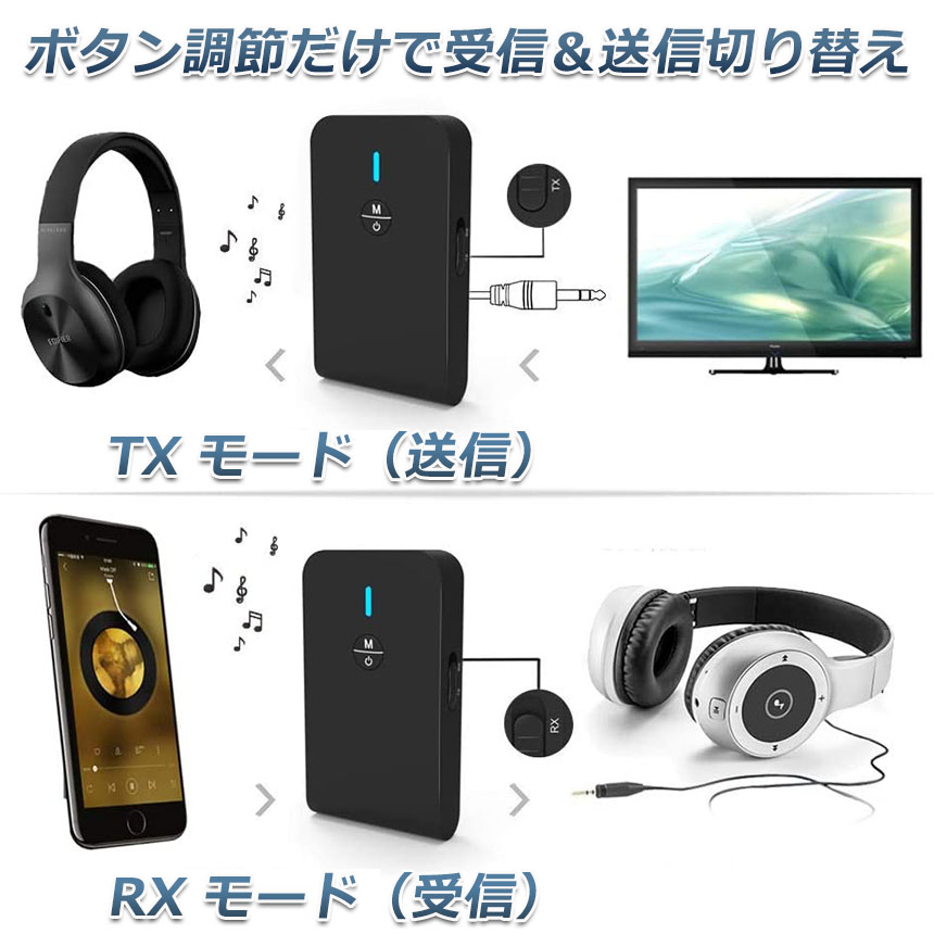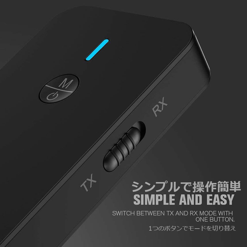 【一台二役】本製品は送信と受信の両方に使用可能なBluetoothオーディオトランスミッター&Bluetoothオーディオレシーバーです。送信機モードや受信機モードはワンタッチで簡単切替えできます。送信機(TXモード):Bluetoothに対応していない携帯オーディオプレイヤーやテレビと繋いで、Bluetooth対応のスピーカーやヘッドセットなどと接続ができます。受信機(RXモード):Bluetoothに対応していないイヤホンやヘッドホンを繋いで、Bluetooth対応のスマートフォンや携帯オーディオプレイヤーなどと接続ができます。※通話はできます。