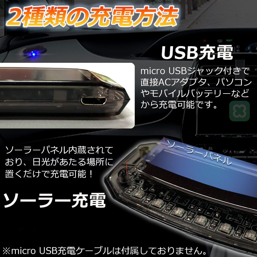 【ソーラー&USB充電】太陽光があるかぎり、防犯し続けます、ソーラー電源を内蔵しているため、日中は自動で充電し、暗くなると自動で点滅を開始。太陽光があるかぎり、防犯し続けます。micro USBでも充電可能です。