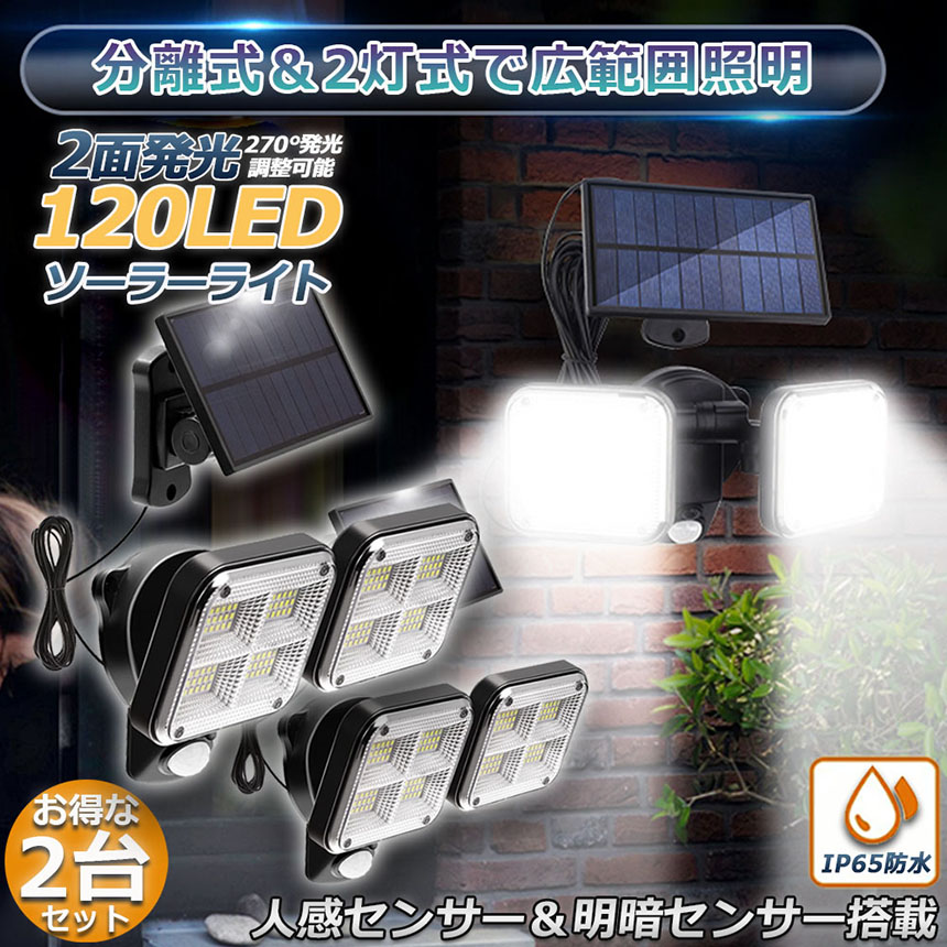 【120LED・2面発光・270°照明】 120個のLEDチップが搭載しており、夜間により強い光を提供できます。2面発光のデザインで照明角度が270°に達すだけでなく、両側のライトは上下左右120°回転することができますから、照明が必要な場所で照明角度を自由に変えられます。ラーパネルの部分は上下左右80°の角度に調節できますので、太陽の良く当たる方へ向けられ、十分にソーラー充電できます。センサー検知角度が120°になりましたので、夜の防犯灯としてもすごく実用です。