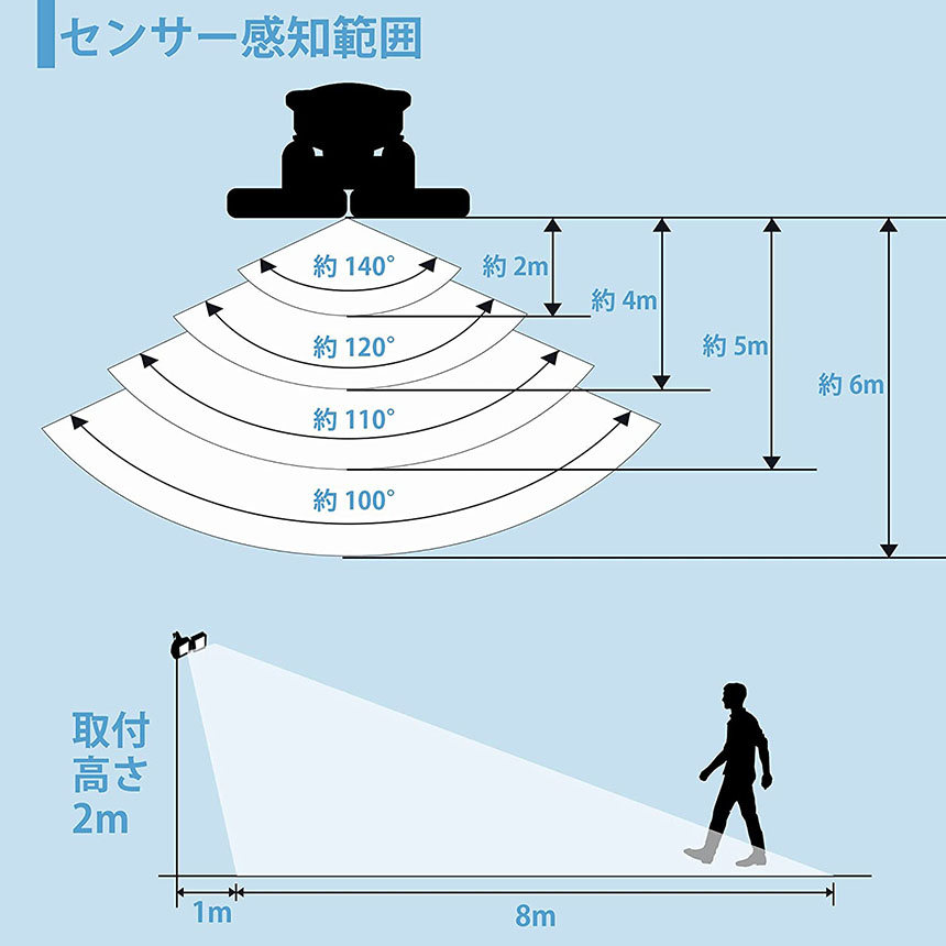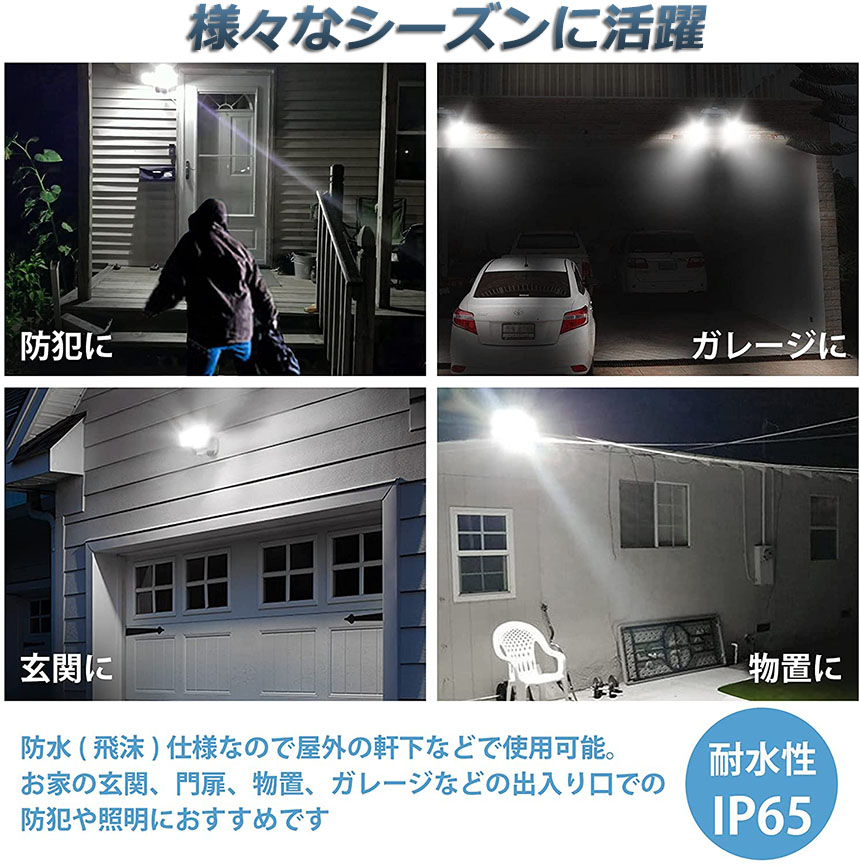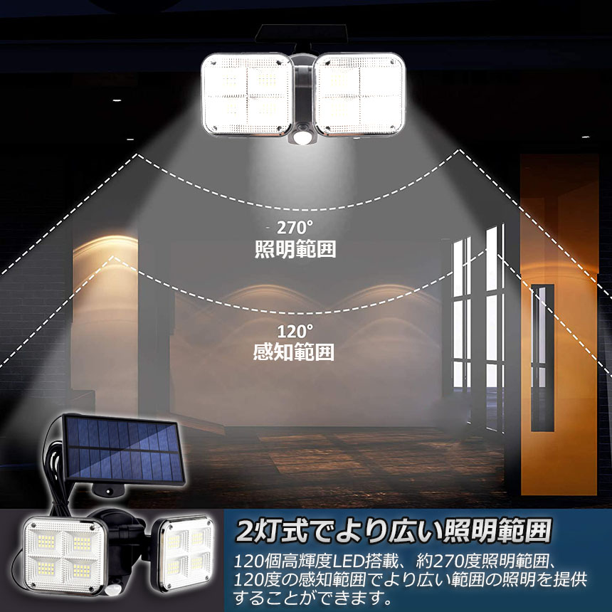 【120LED・2面発光・270°照明】 120個のLEDチップが搭載しており、夜間により強い光を提供できます。2面発光のデザインで照明角度が270°に達すだけでなく、両側のライトは上下左右120°回転することができますから、照明が必要な場所で照明角度を自由に変えられます。ラーパネルの部分は上下左右80°の角度に調節できますので、太陽の良く当たる方へ向けられ、十分にソーラー充電できます。センサー検知角度が120°になりましたので、夜の防犯灯としてもすごく実用です。